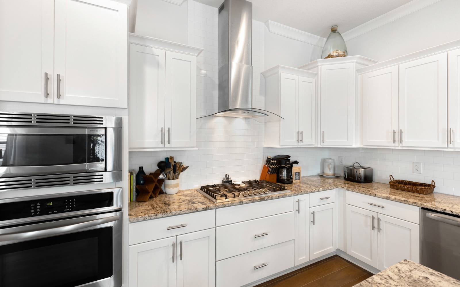 In the upscale kitchen, a full suite of stainless-steel appliances lets you whip up a delicious breakfast and enjoy it at the kitchen bar, which seats three. The expansive dining area is a great spot to share stories and meals with your family.