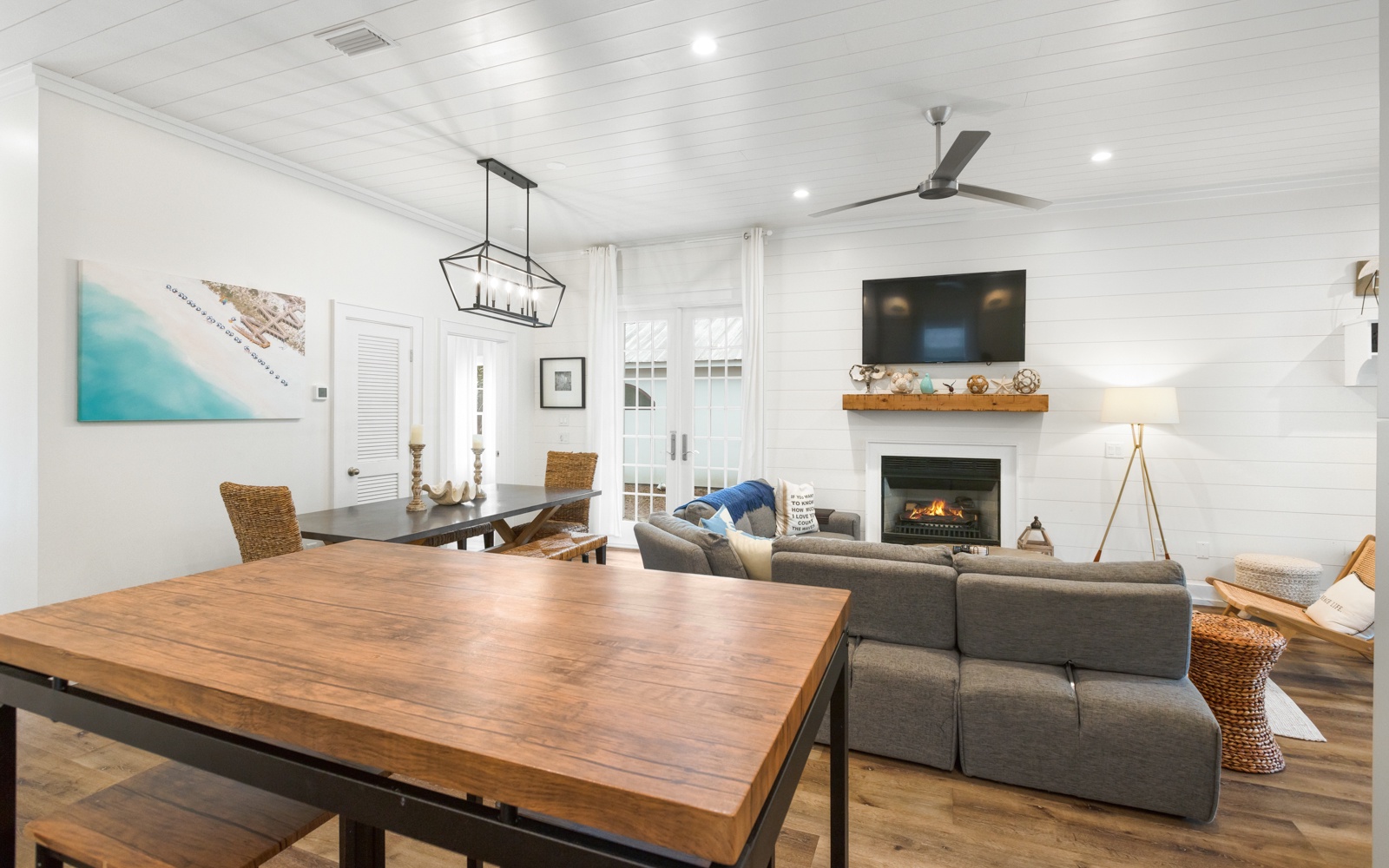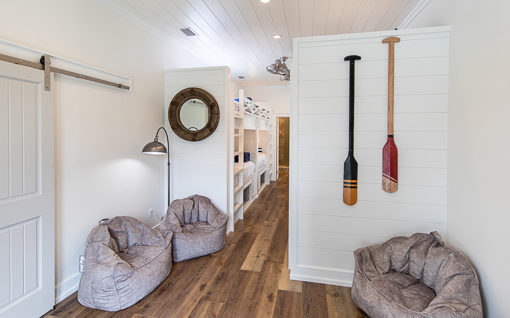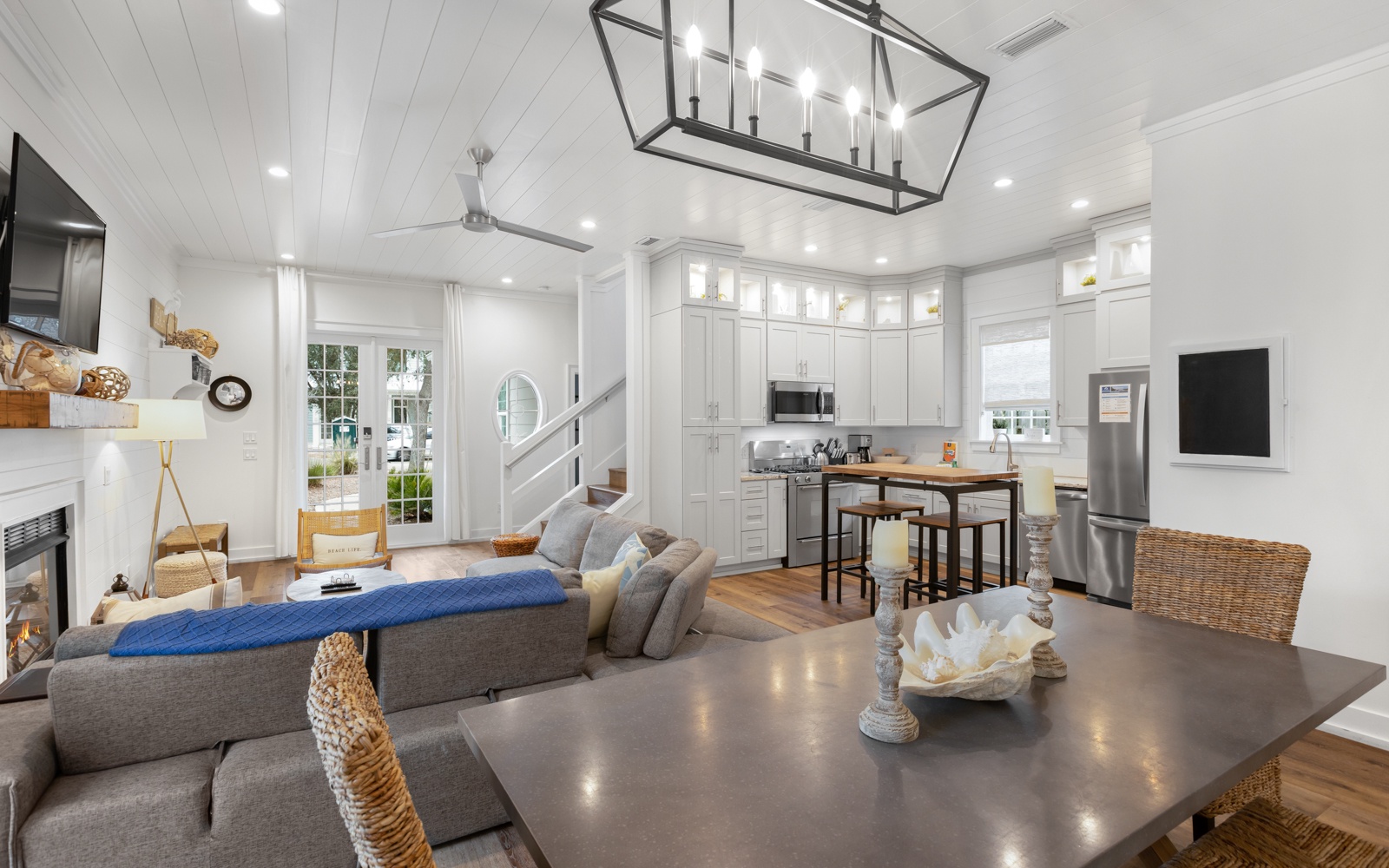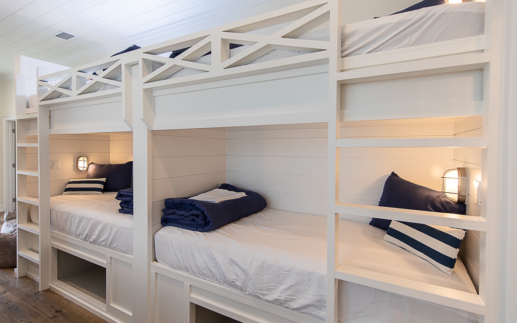 Perfect for two families, the home has two primary bedroom suites downstairs, and an extravagant bunk room for kids and adults upstairs, with plush mattresses (three full-size and four twin-size). The open living, dining, and kitchen area provides a lot of space for entertainment. Out back, enjoy lounging and grilling next to the beautiful private pool.