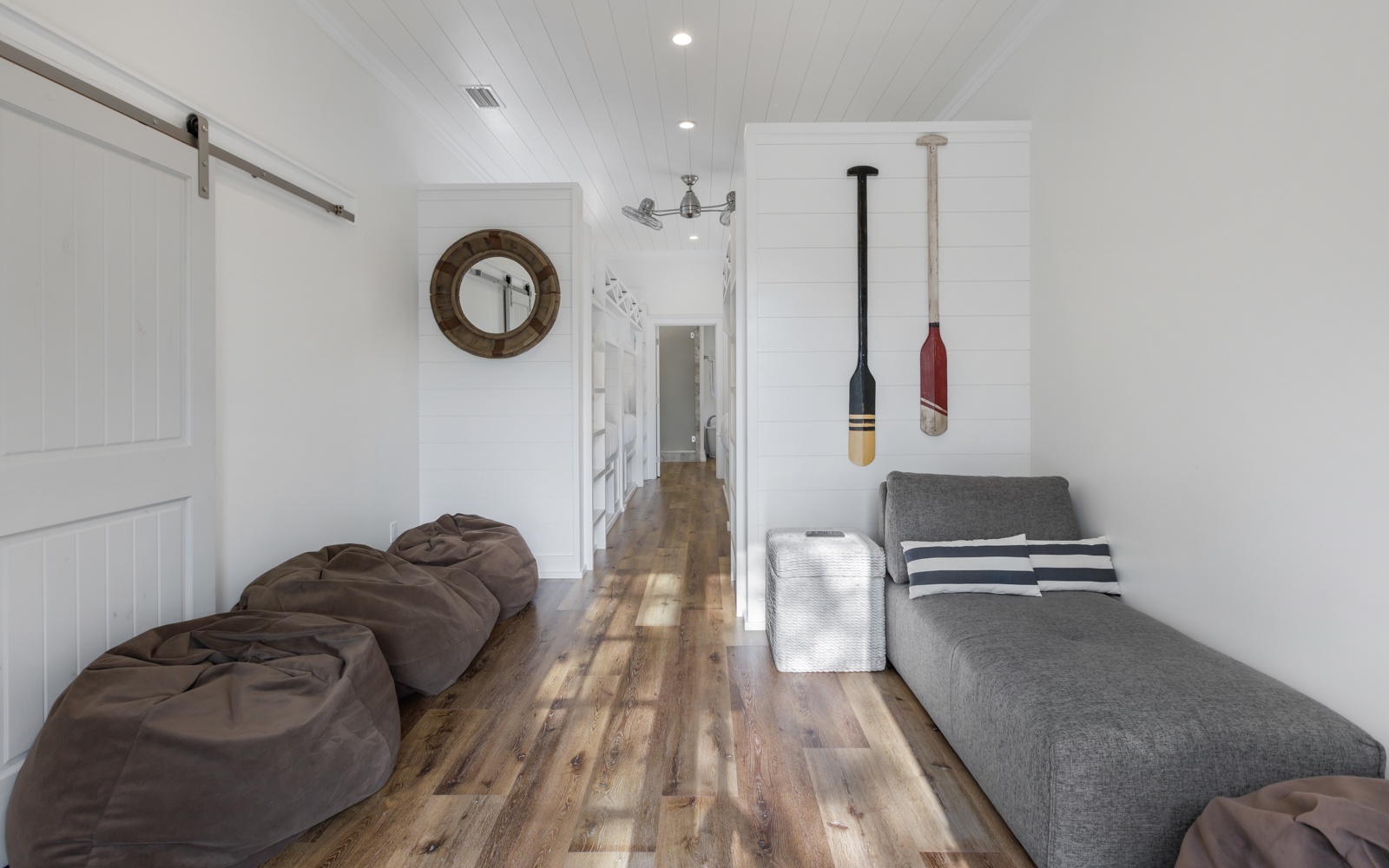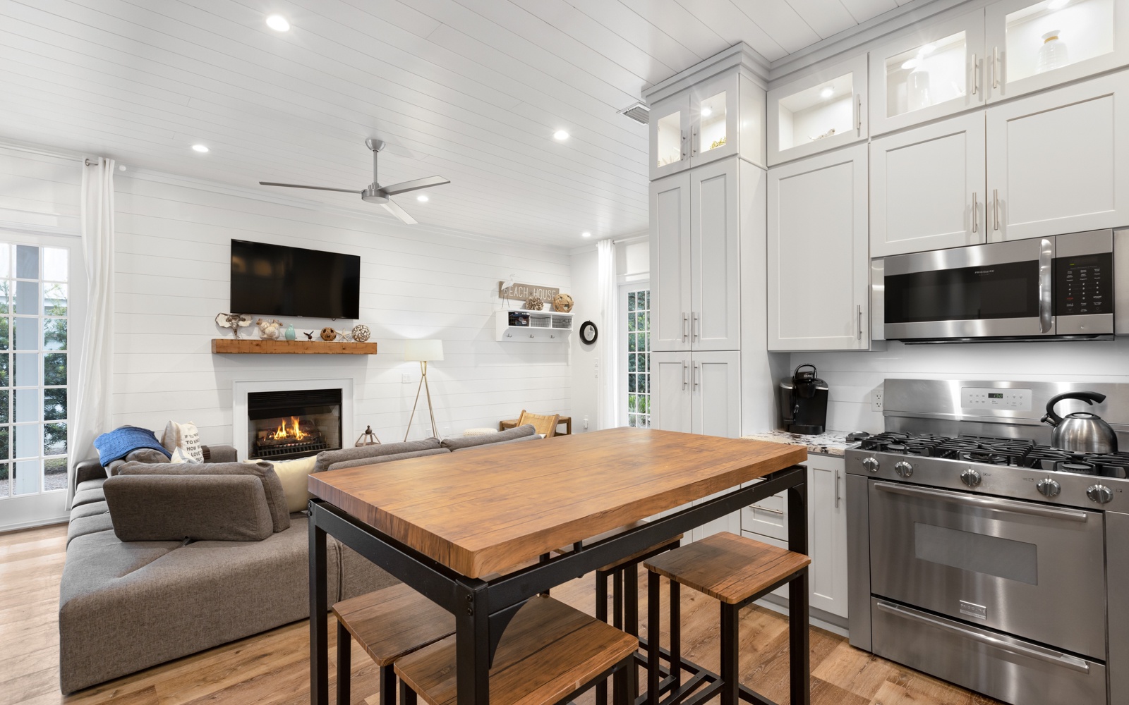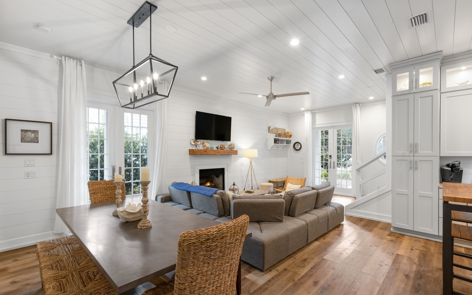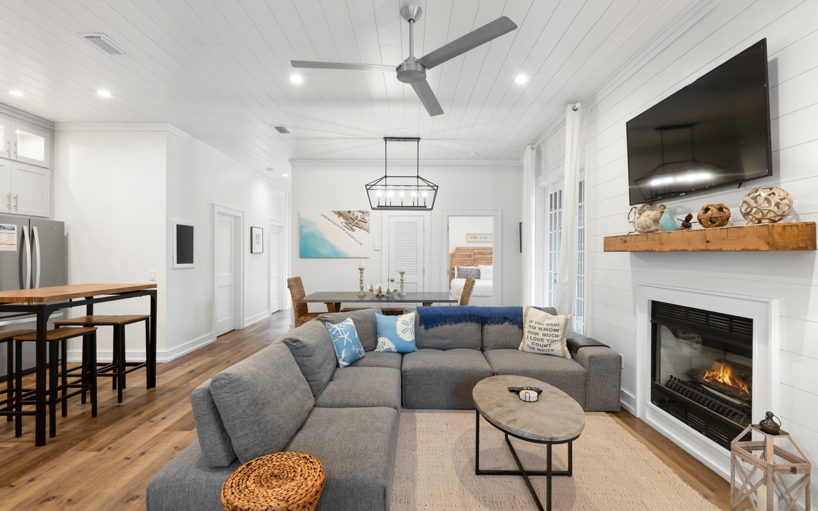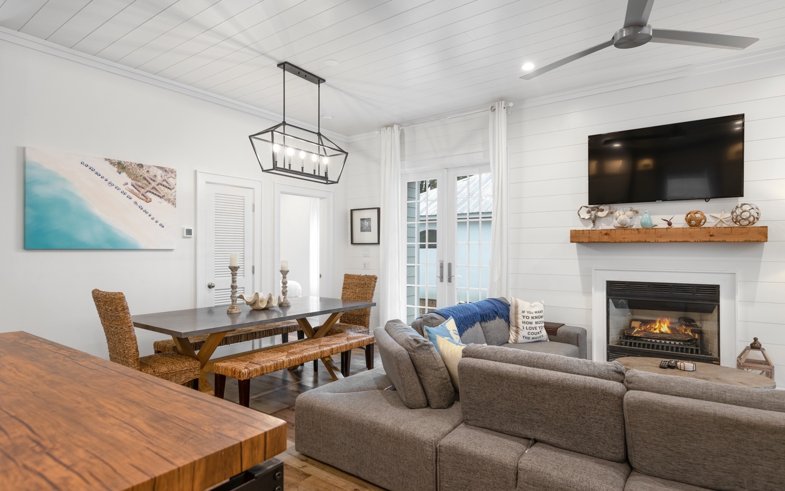 Perfect for two families, the home has two primary bedroom suites downstairs, and an extravagant bunk room for kids and adults upstairs, with plush mattresses (three full-size and four twin-size). The open living, dining, and kitchen area provides a lot of space for entertainment. Out back, enjoy lounging and grilling next to the beautiful private pool.