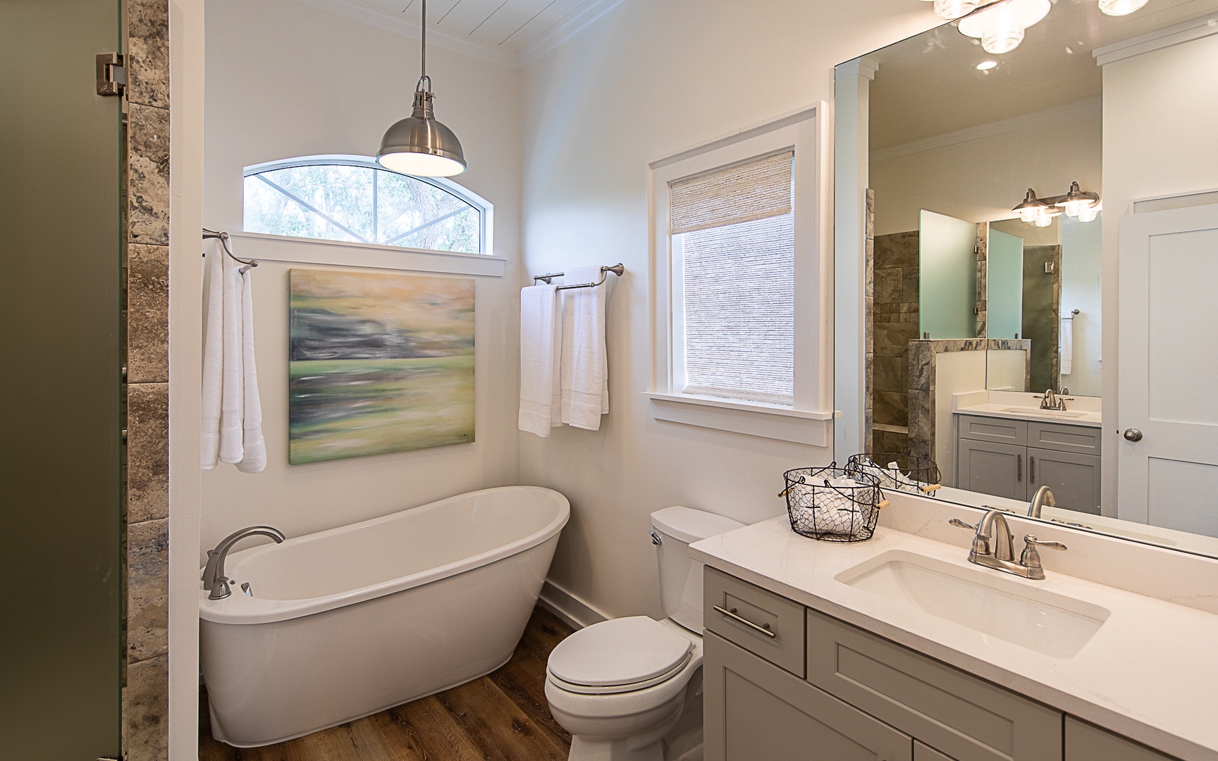 - King in 1st floor primary bedroom, private bath, TV