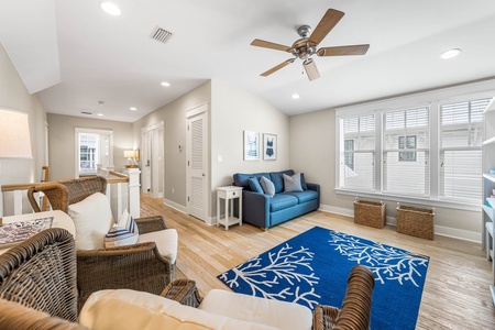 Upstairs, the fun continues with three more bedrooms: a king, a queen, and a bunk room built for four (and possibly a few epic sleepovers). There’s also a second hangout space up here for movie marathons, game nights, or post-beach recharging.