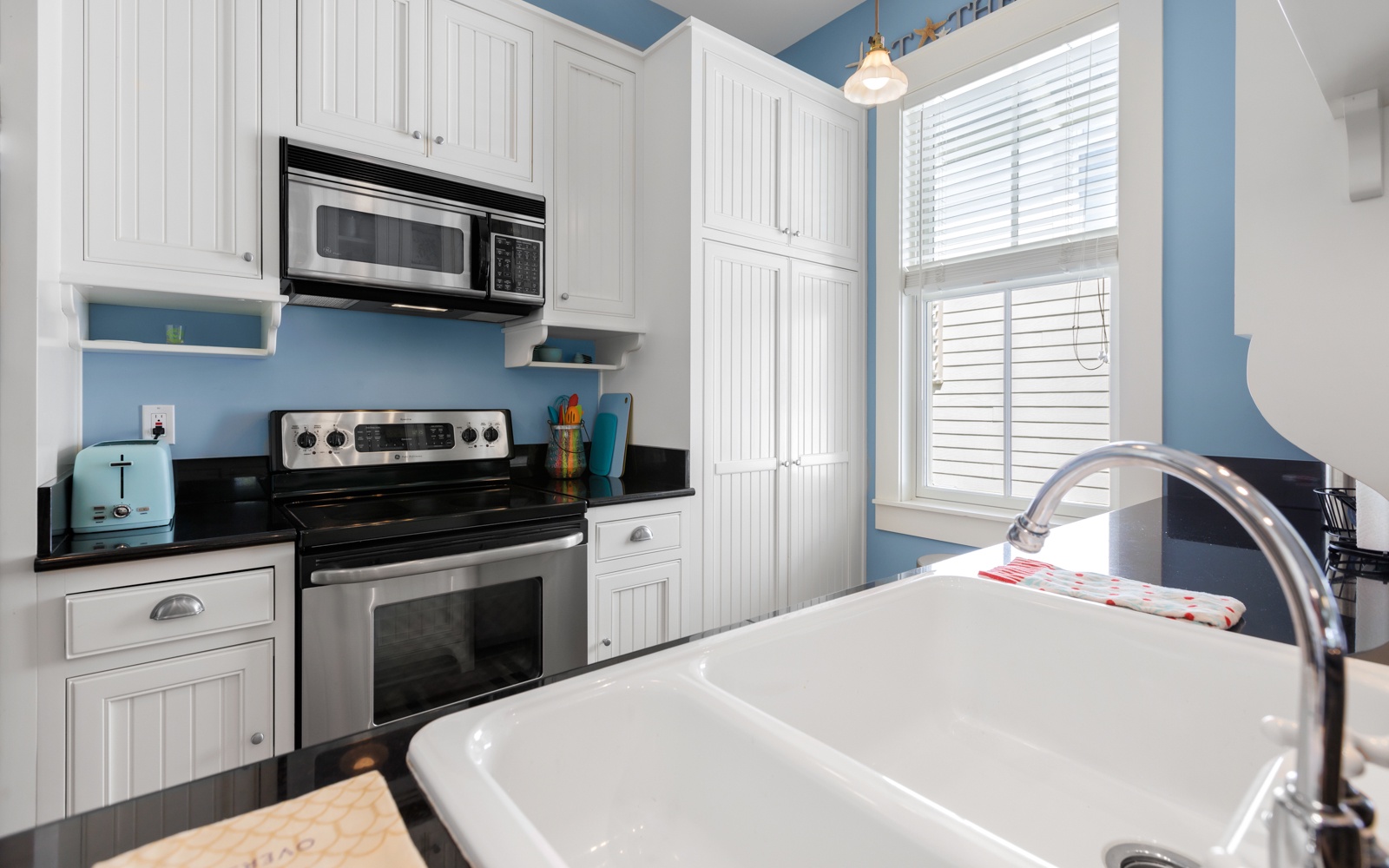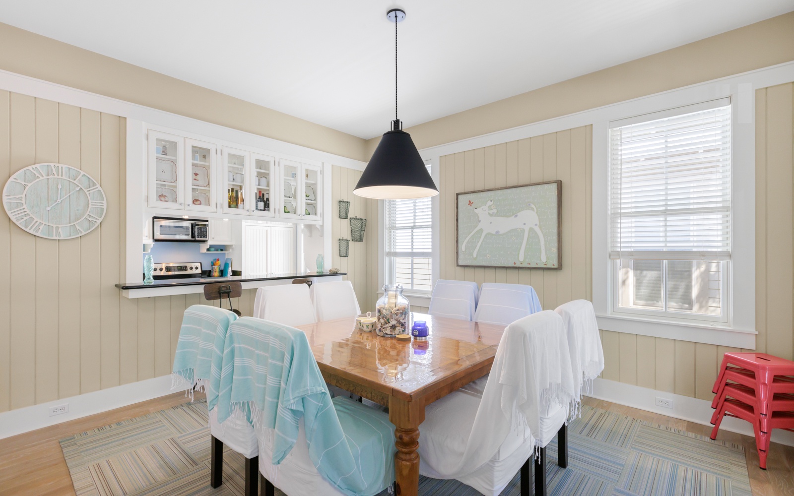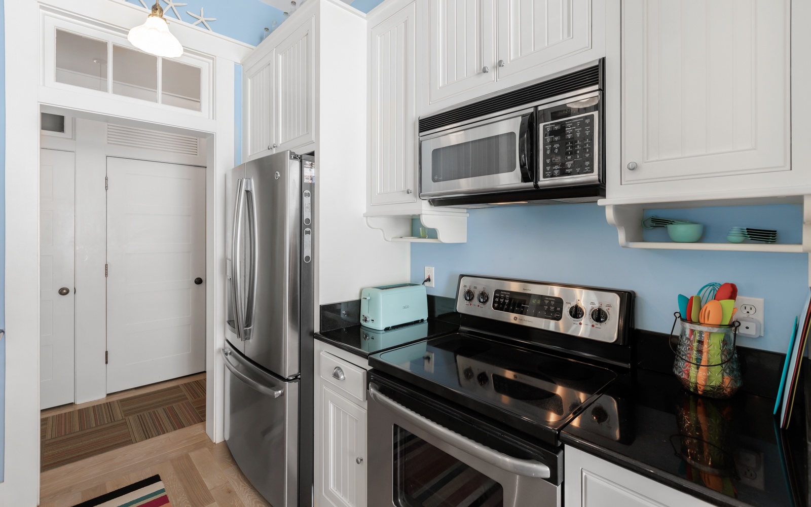 The colorful interiors of Cobalt Close and Cozy are adorned with local artistry, providing a delightful sanctuary of comfort and style. The inviting living area, with TV and sleeper sofa, is complemented by a dining room table and a breakfast bar opening into a spacious kitchen, ideal for whipping up appetizers after a day in the sun.