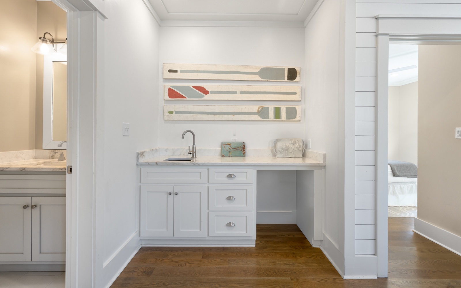 Inside, the home is beautifully decorated and inviting. The large chef’s kitchen has professional-grade appliances and plenty of workspace. The large farmhouse dining table seats 8, and the kitchen island seats 3.