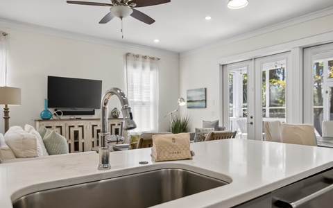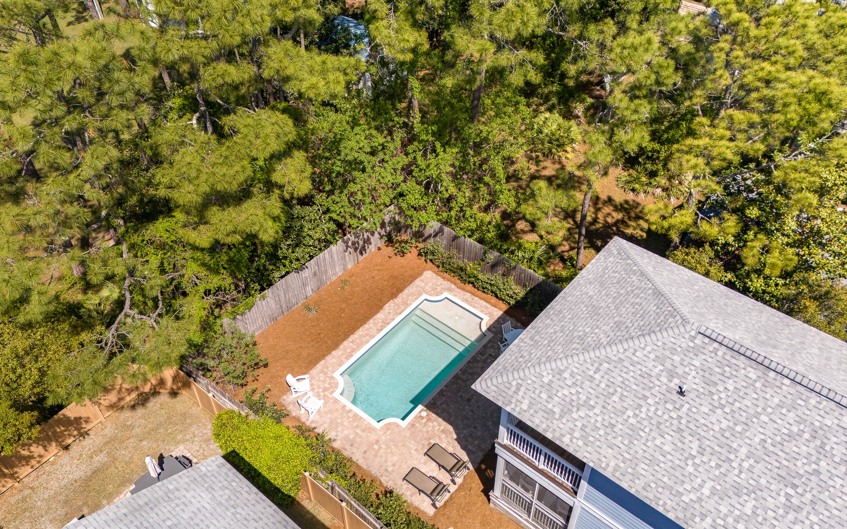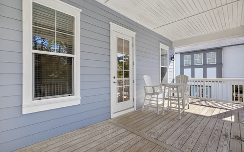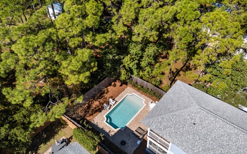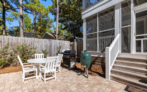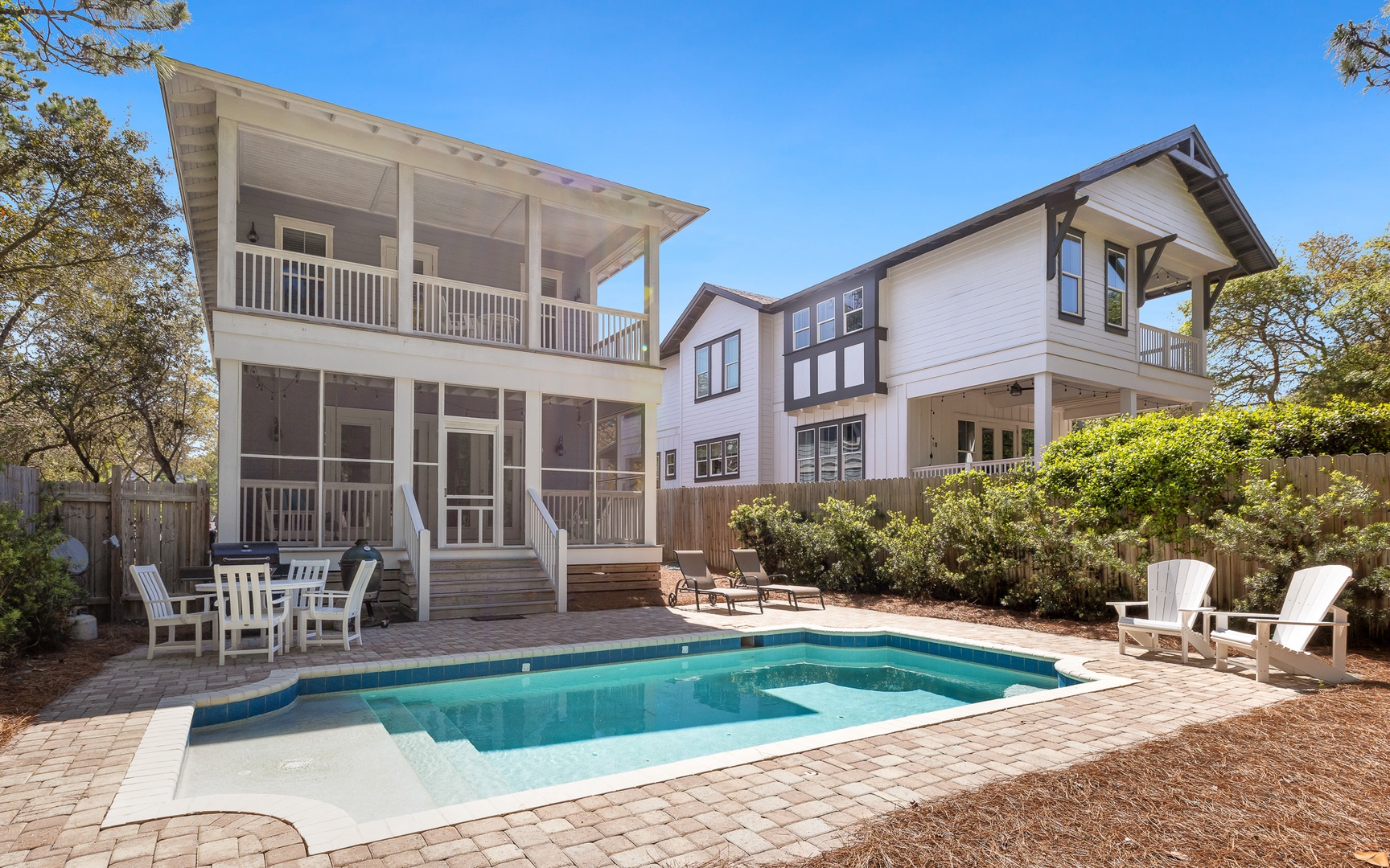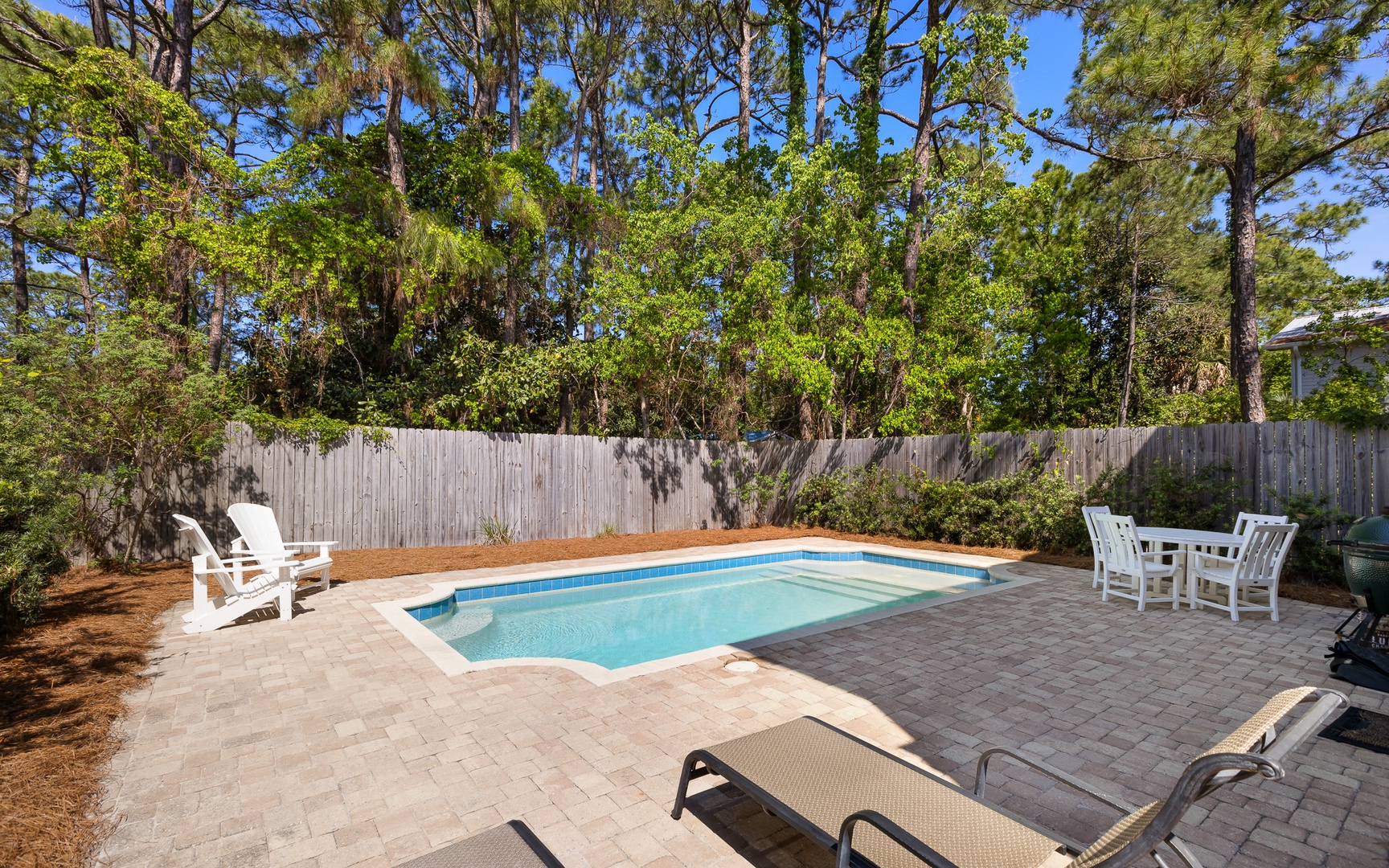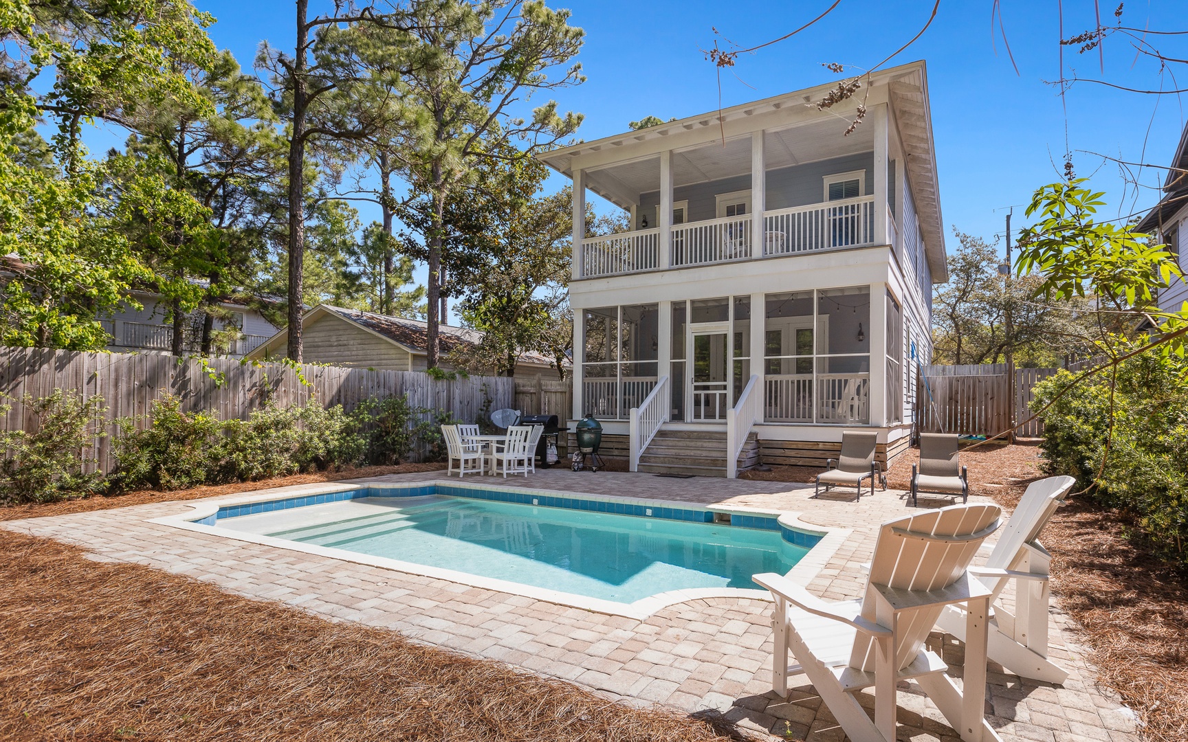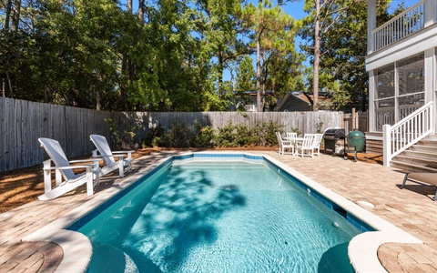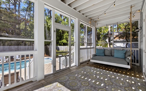 Outside, the private pool is very inviting. And along with a large Green Egg grill, this is definitely a vacation highlight, an excellent area for the entire family to unwind. Overlooking the pool area is the screened-in back porch. This wonderful space, with a hanging day bed, can be accessed through the French doors in the open living area.