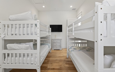 Nearby, a primary suite, king, has a private bath with large walk-in shower and dual vanity. The second floor hosts another primary suite, king, with a private bath, a large walk-in shower, and large soaking tub. This suite also has a private balcony. A third guest room, king, has a private balcony overlooking the pool and a shared full bath. The fourth guest room has two twin bunk beds (4 twin beds) and a shared bathroom.