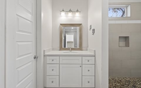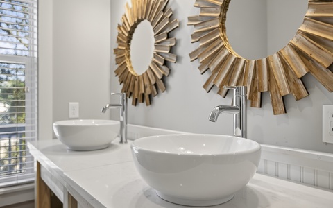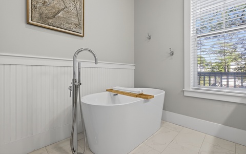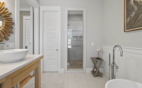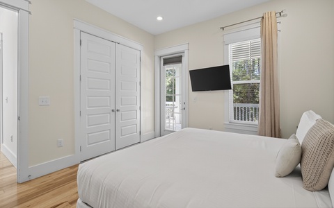 - King in 2nd floor primary; walk-in shower, soaking tub; private balcony; TV