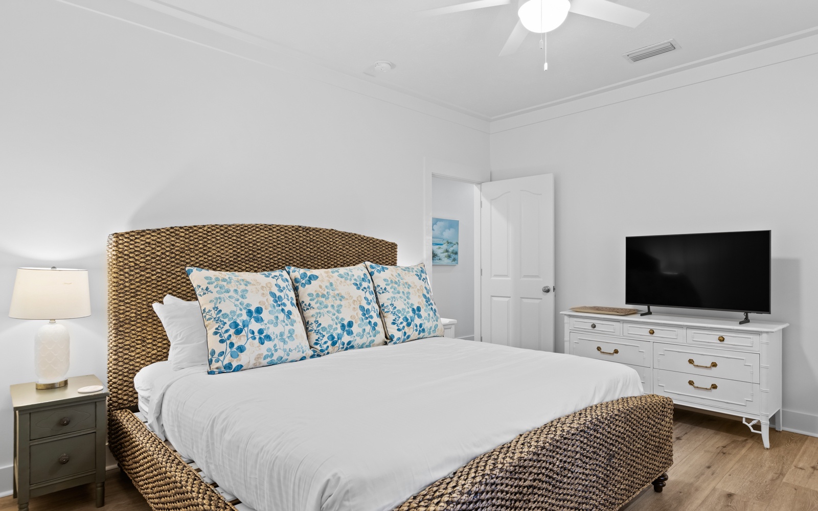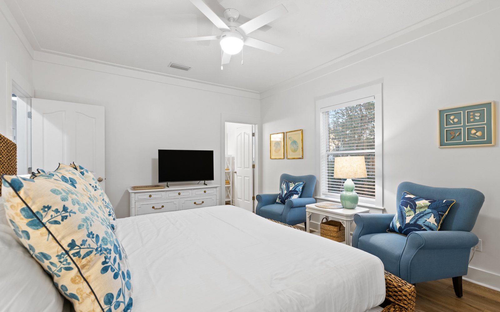 - Primary Suite: King bed, en-suite bath, TV