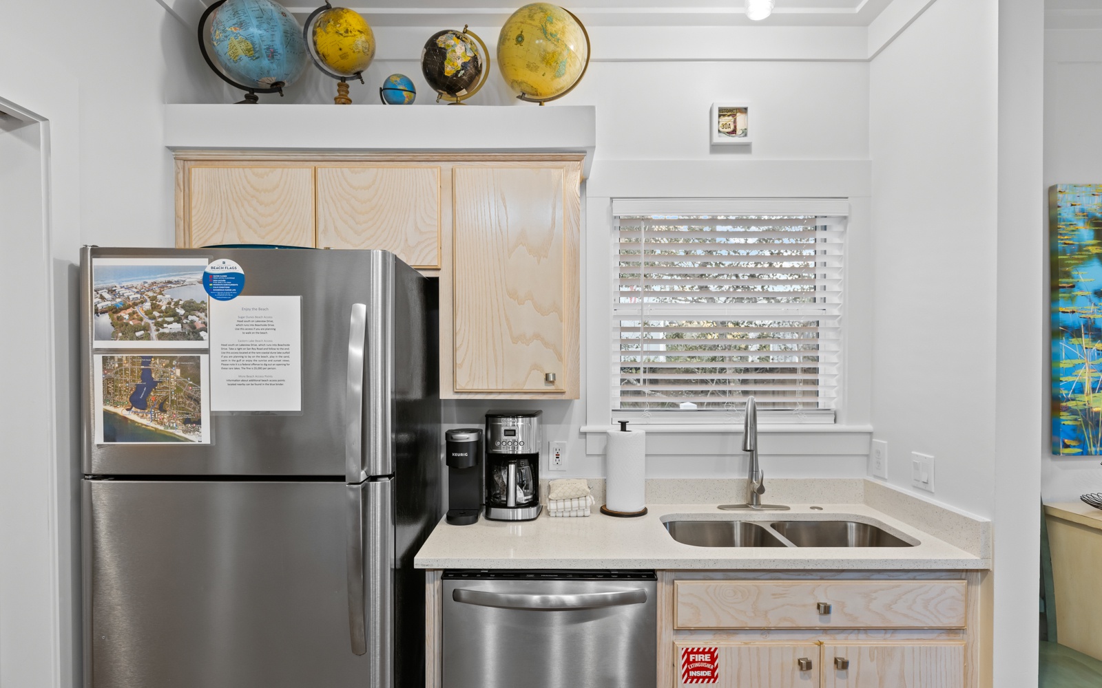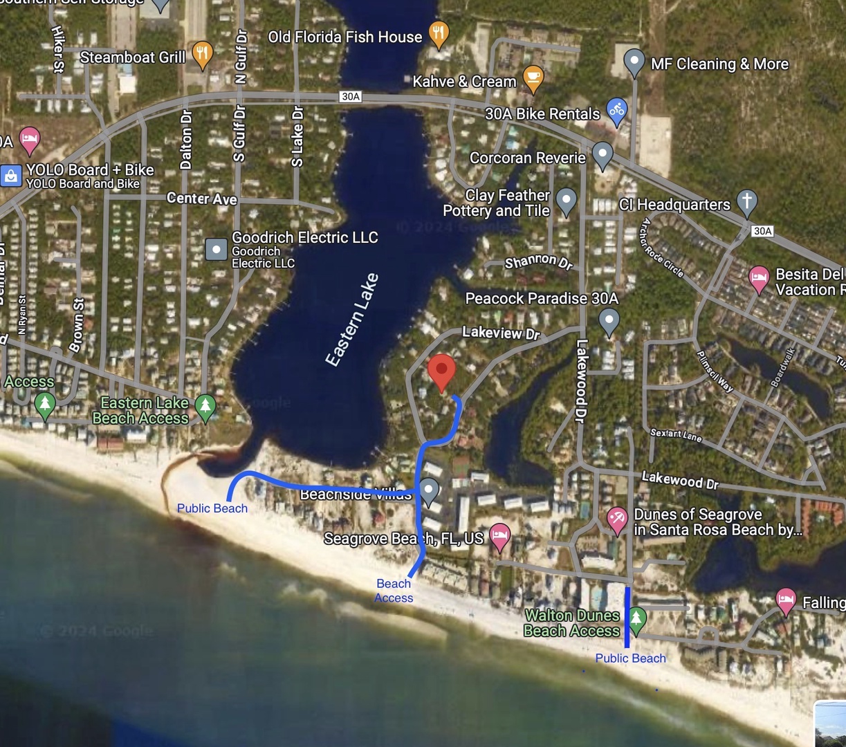 San Roy Road and Sugar Dunes Beach Access are both within easy reach. San Roy offers a quieter stretch of shoreline, while Sugar Dunes is great for sunset views, with bike racks and showers for convenience. The Eastern Lake boat launch is just around the corner, and kayak rentals are close if you're ready to explore.