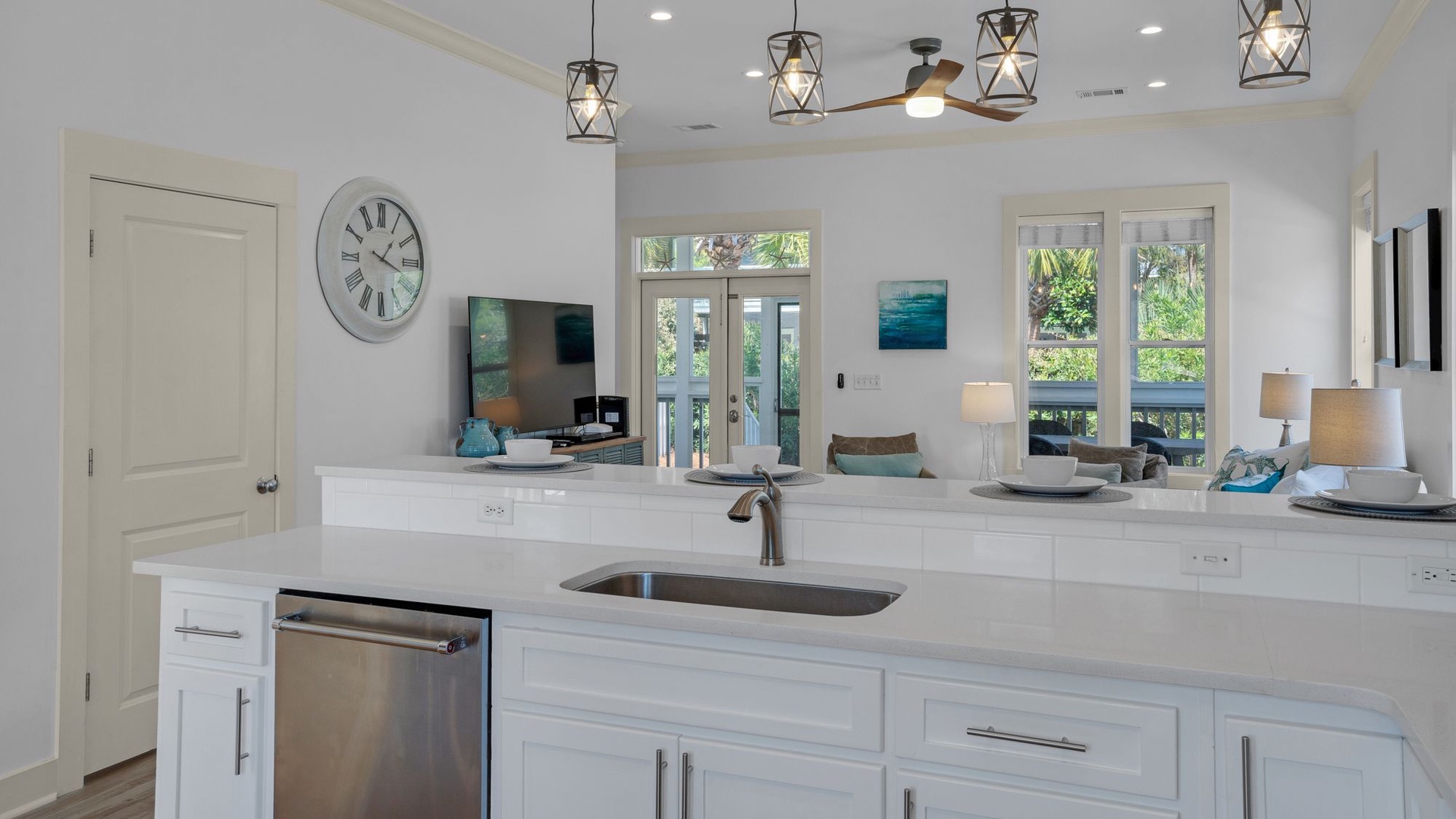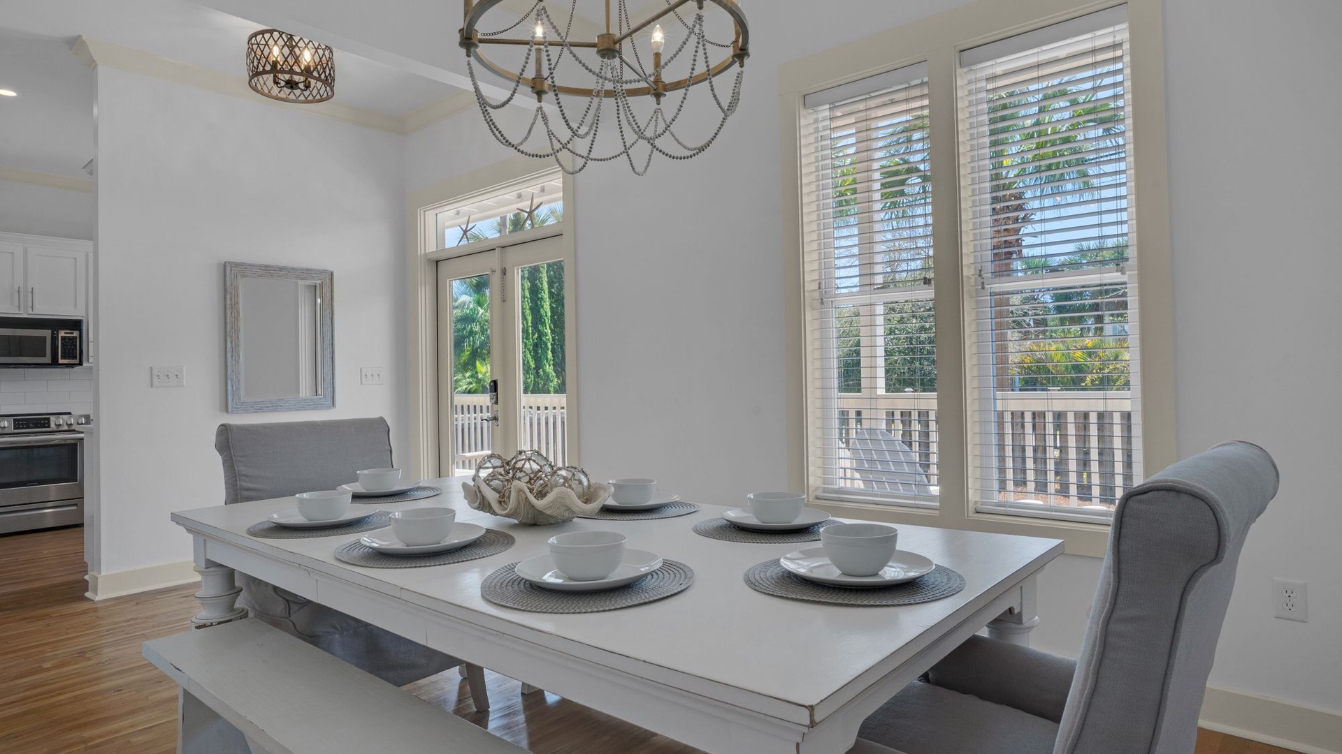 The main level is open and full of natural light, framed by soft coastal tones and thoughtful design. The kitchen is sleek and social, with stainless appliances, plenty of prep space, and seating for four at the counter. The dining area nearby fits eight more, ready for long meals and even longer conversations. French doors open to a screened patio where dinner outdoors, with the gulf breeze, feels heavenly.