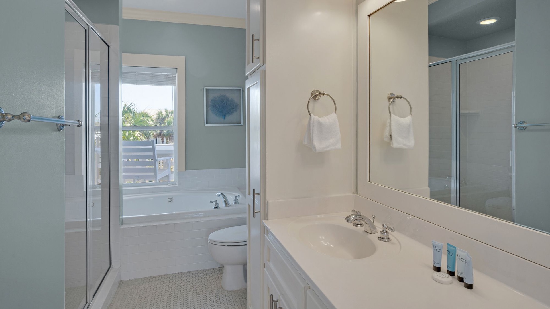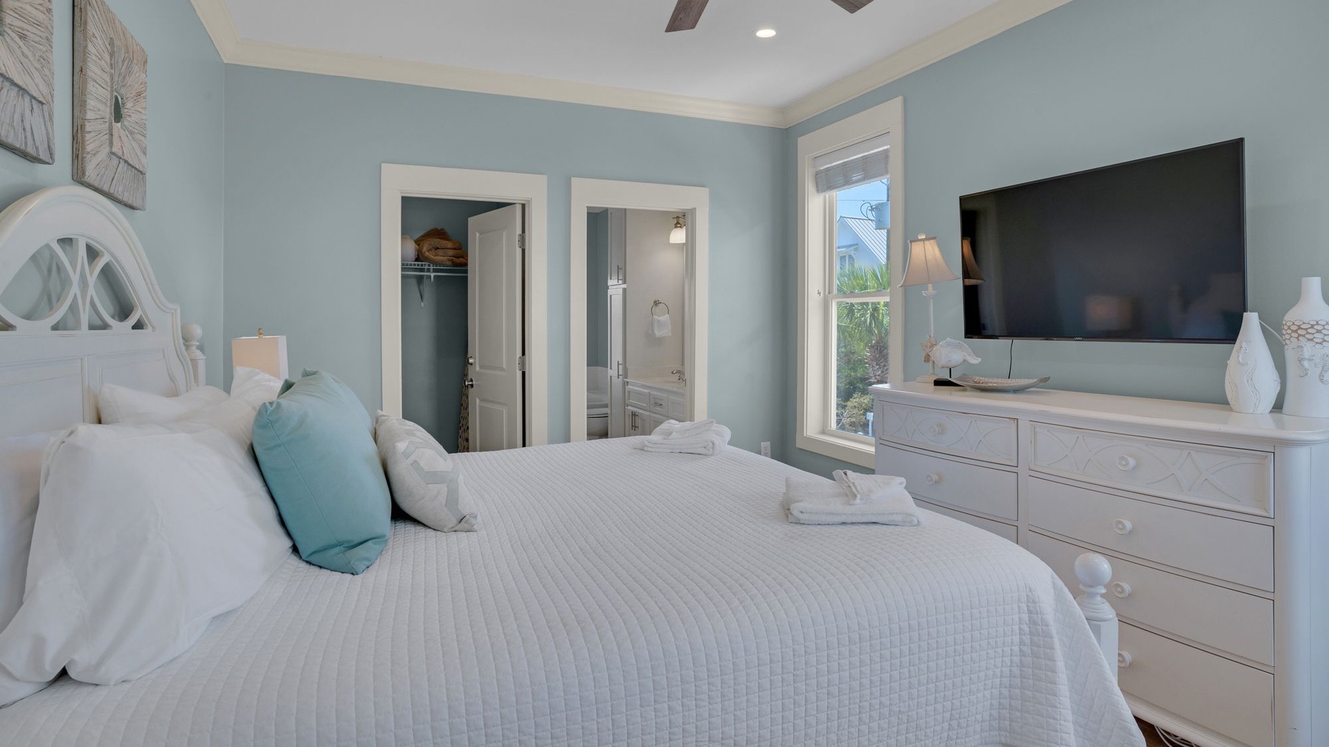 - Primary Bedroom: King bed, private bath with jacuzzi tub, TV