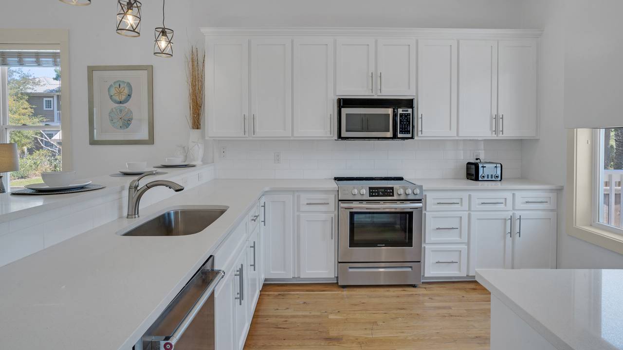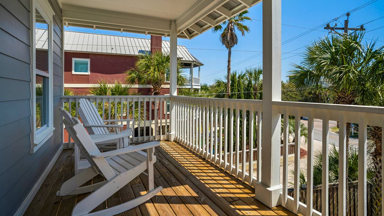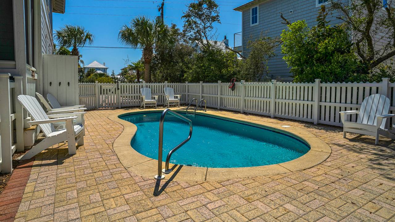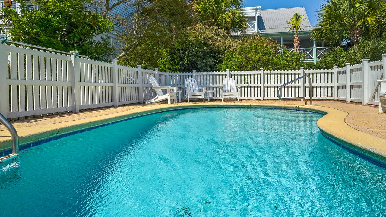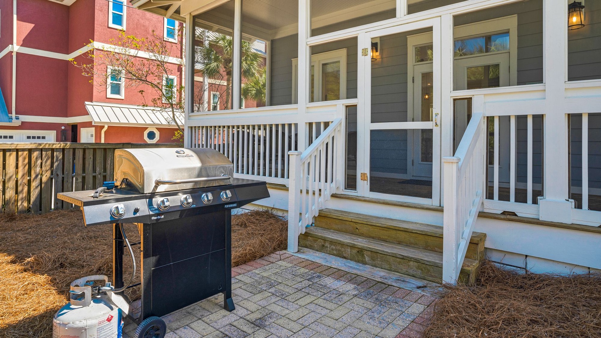 Out back (didn’t we already mention the pool?), the private fenced yard turns into its own little resort: That pool! The comfortable loungers and a gas grill for afternoon cookouts is the perfect spot to unwind after a day at the beach.