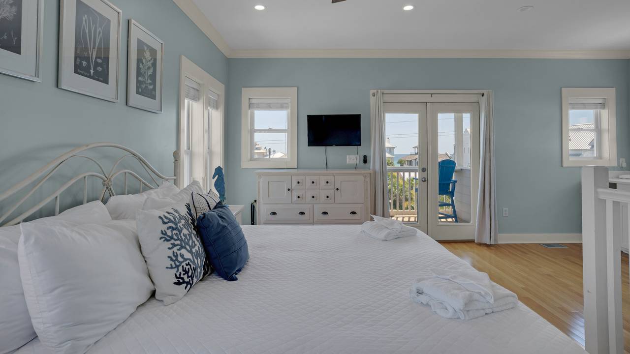 - Primary Bedroom: King bed, private bath, private balcony with Gulf views, TV