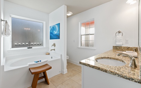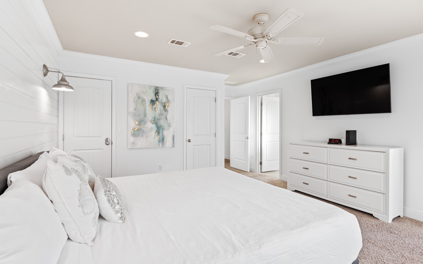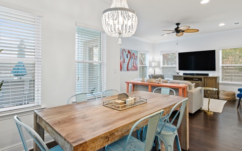 In the beautiful 3-bedroom two-story home, the first floor is a colorful, open living-dining area and kitchen. The second-floor features three bedrooms, including a primary bedroom, king, with a private bath and its own balcony/deck. A guest room, king, shares hall bath with the third bedroom, featuring a bunk bed with full-size mattresses.