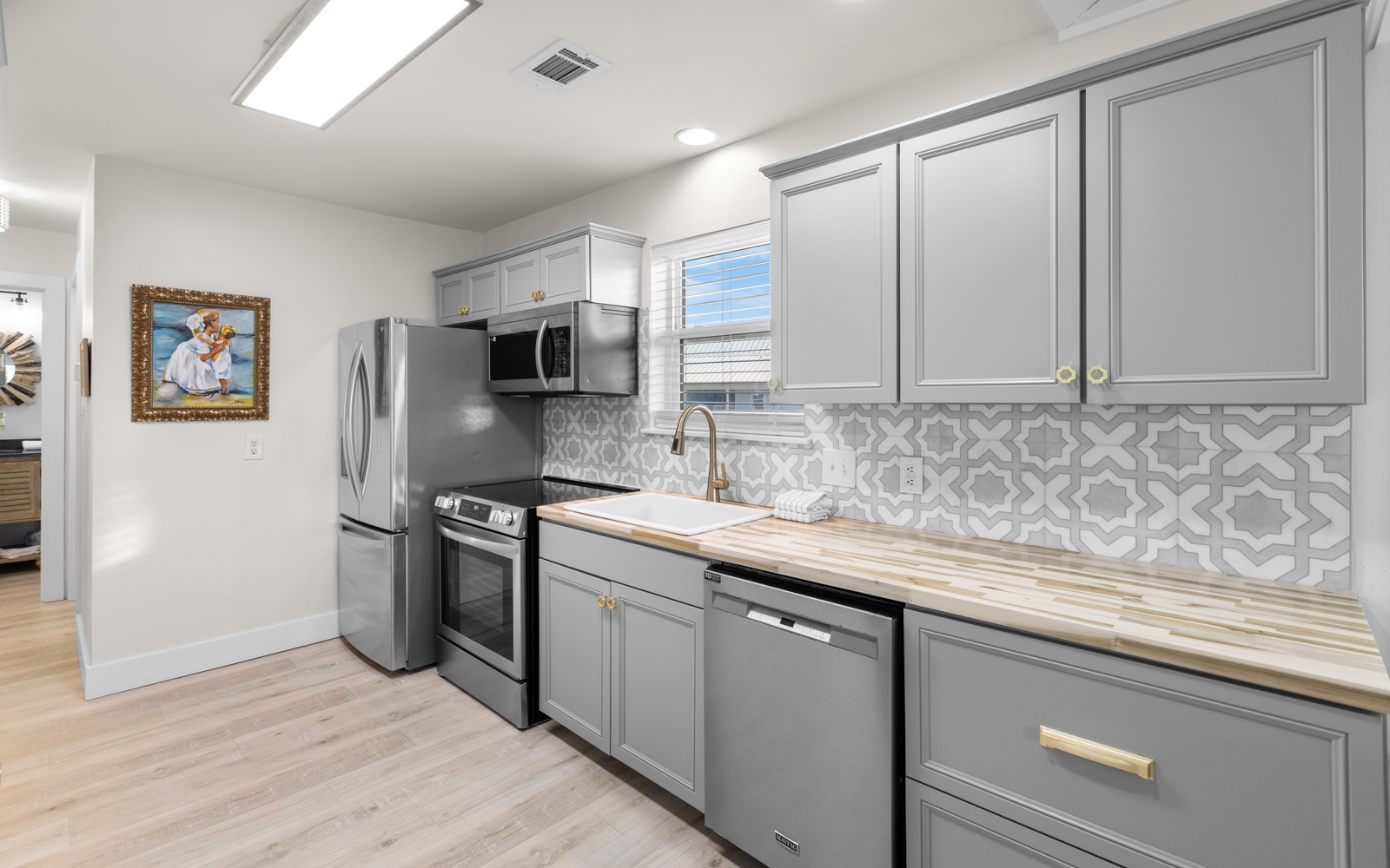 This bright 3-bedroom, 2-bath condo comfortably sleeps 8, with a primary bedroom, king, a second room with two full beds, and a queen bedroom down the hall. The kitchen is fully equipped for family meals, with plenty of seating at the large dining table and bar.