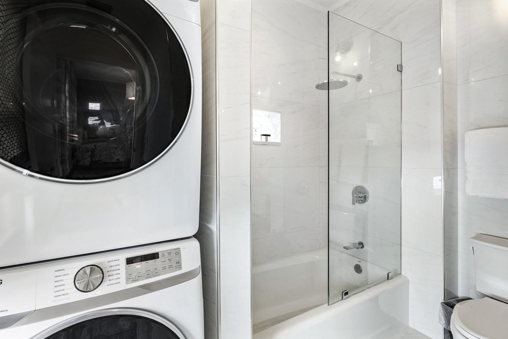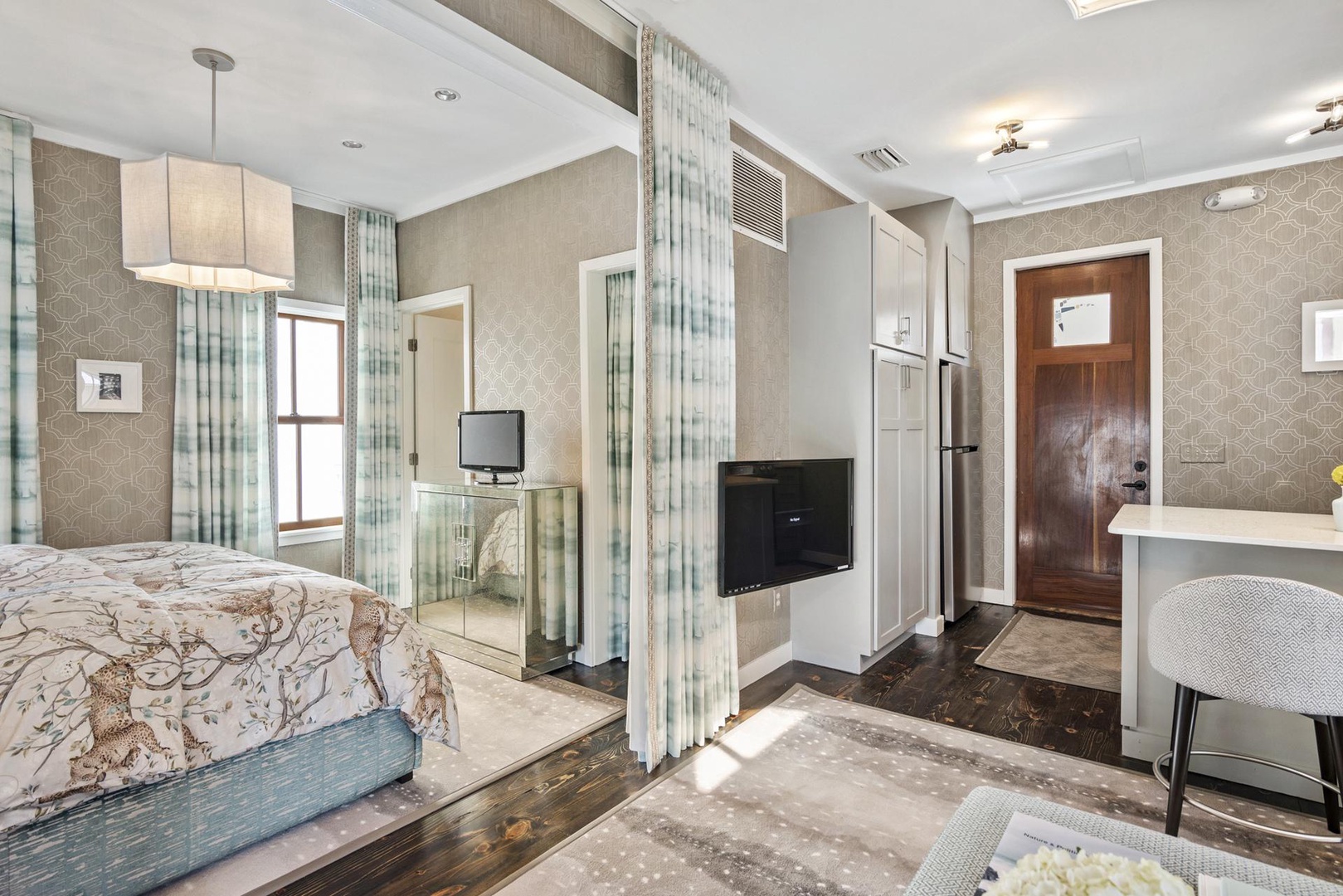 With its private entrance and welcoming living space, the adorable home is designed for comfort and relaxation. The inviting living area features a cozy sofa and two club chairs, while the fully equipped kitchen has everything you need for a convenient stay.