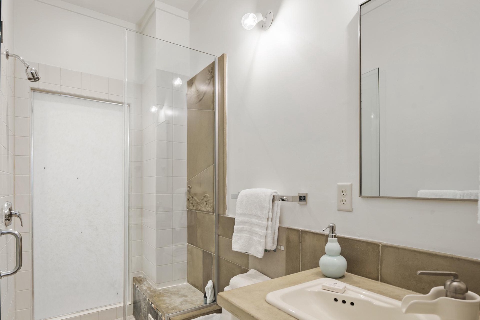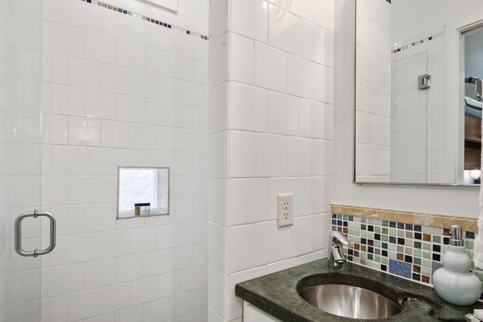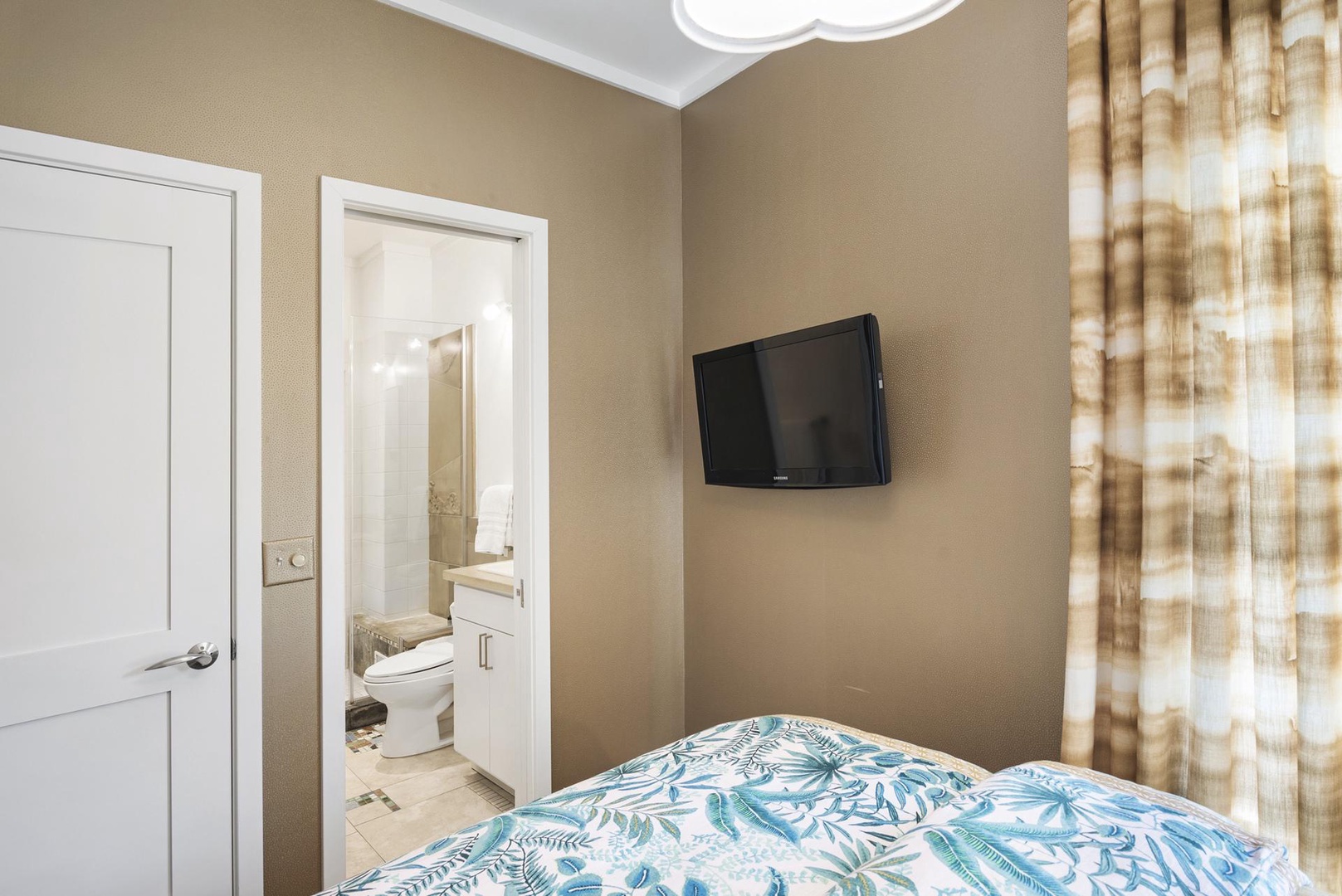 - Primary Bedroom: Queen bed, private bath, tub and glass-enclosed shower, private shuttered porch