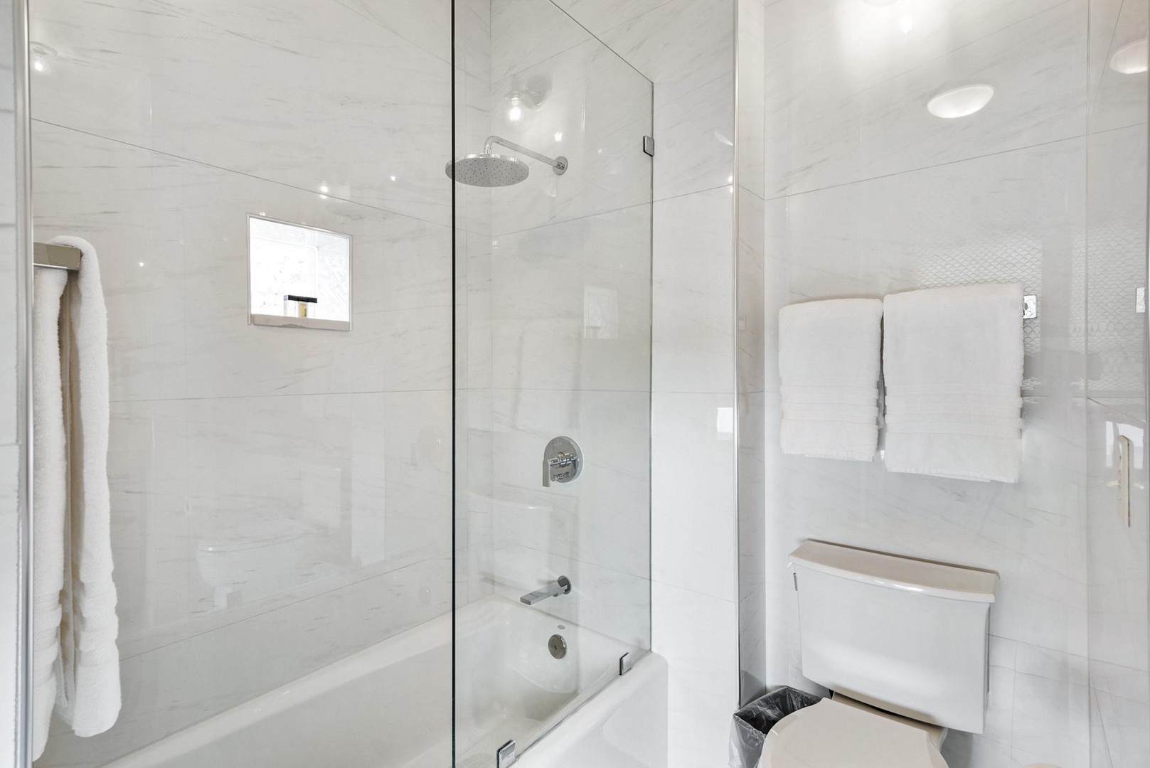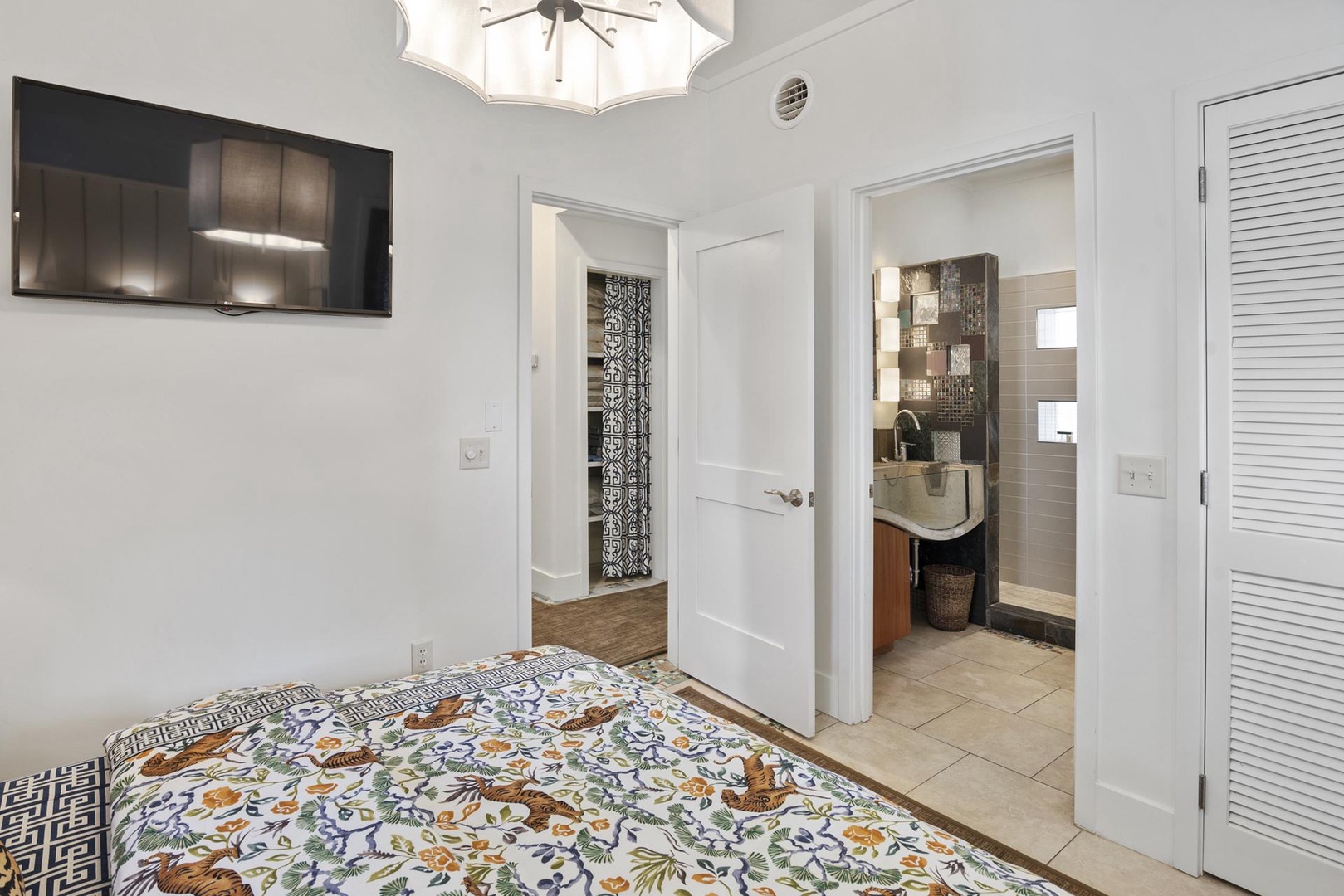 - Primary Bedroom: Queen bed, private bath, tub and glass-enclosed shower, private shuttered porch