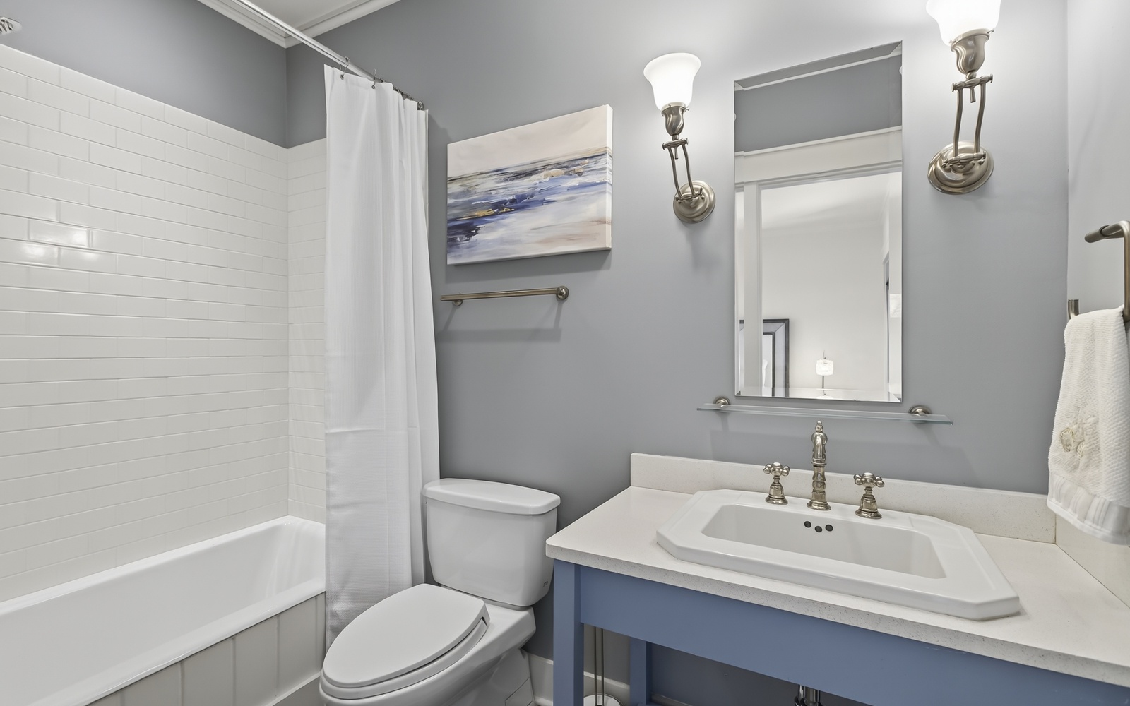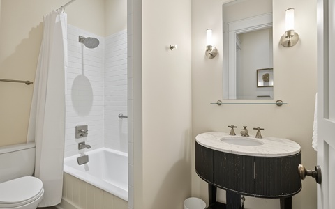 - King in 1st floor guest room; shared hall bathroom with shower/tub combo; TV