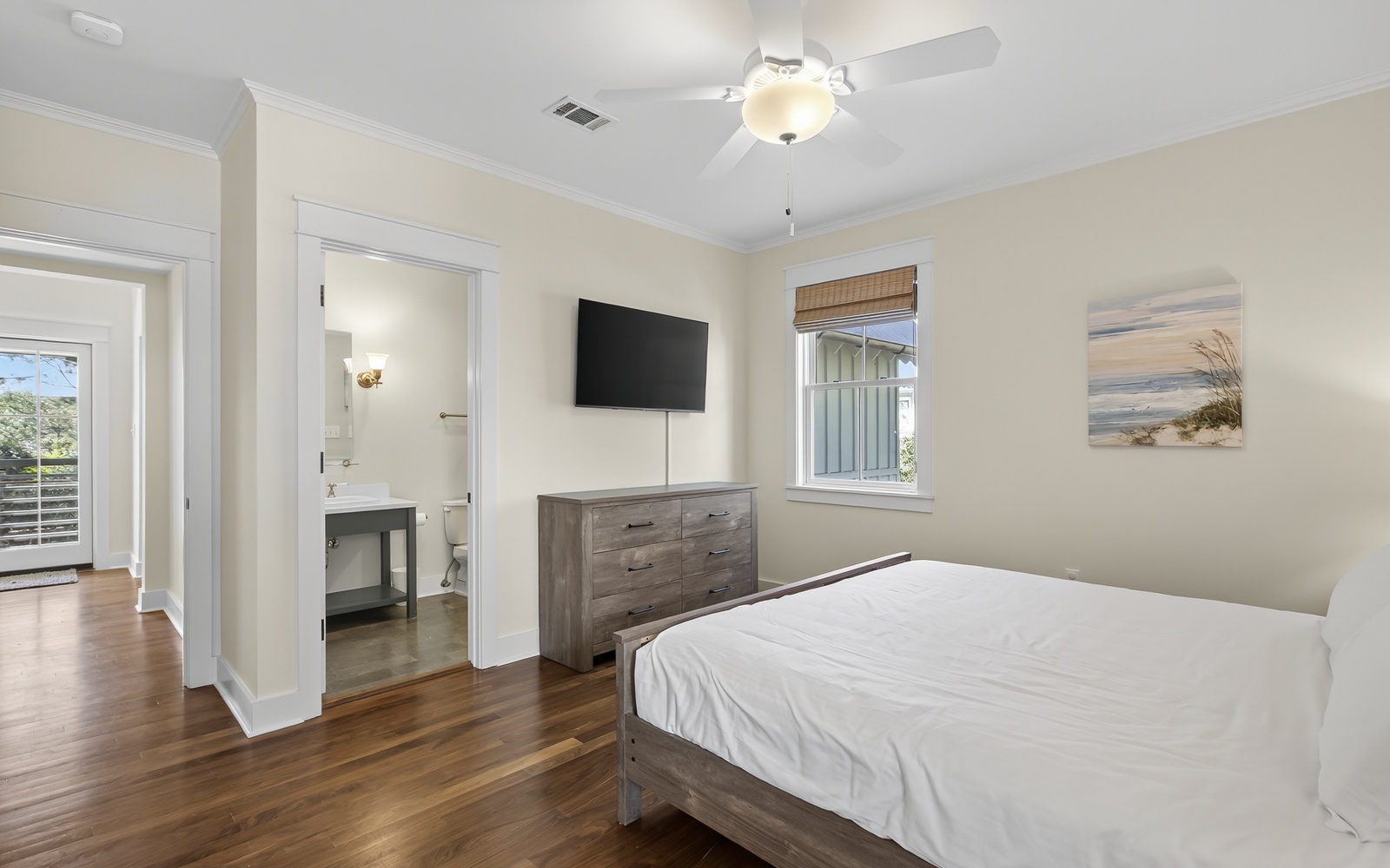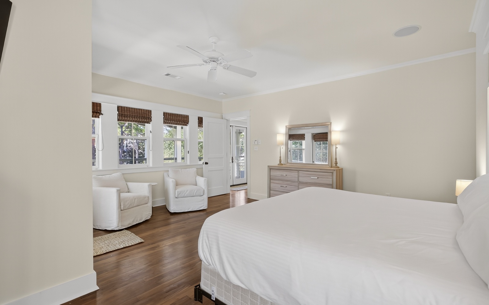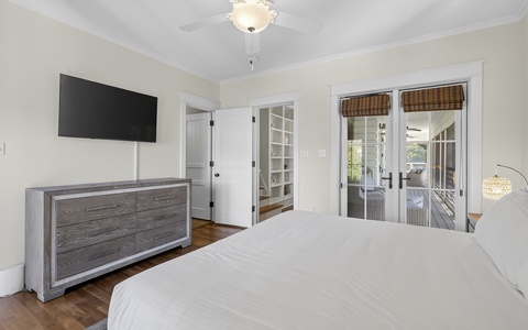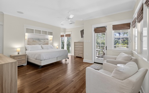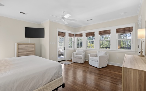 - King in 2nd floor primary room; sitting area; private balcony with TV; ensuite bathroom with walk in shower, double sinks, and private commode area; TV