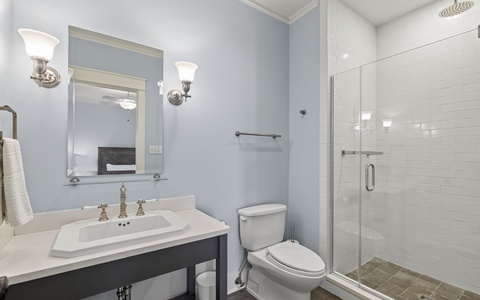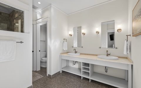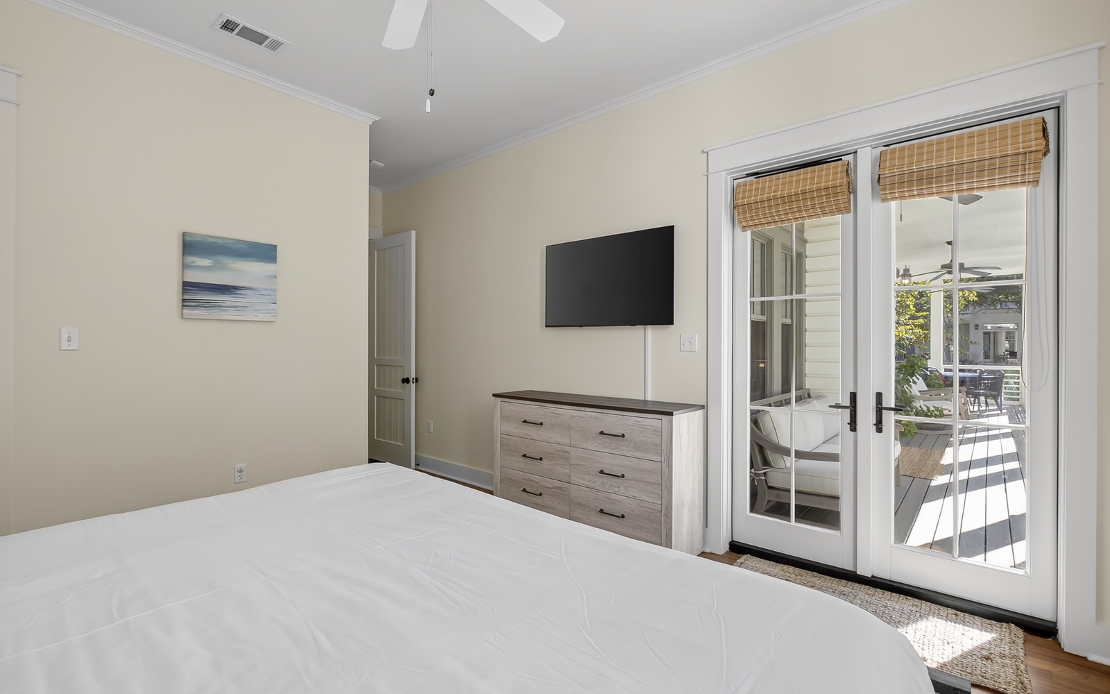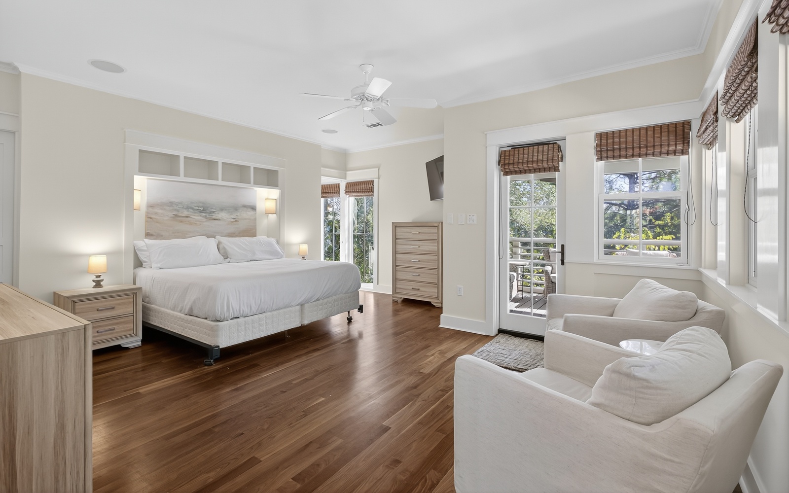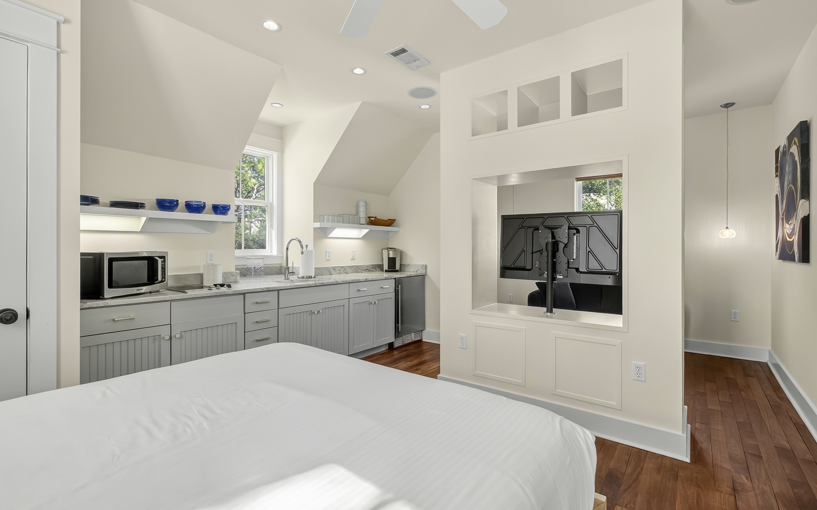 - King in 2nd floor primary room; sitting area; private balcony with TV; ensuite bathroom with walk in shower, double sinks, and private commode area; TV