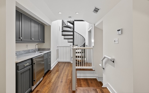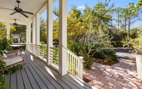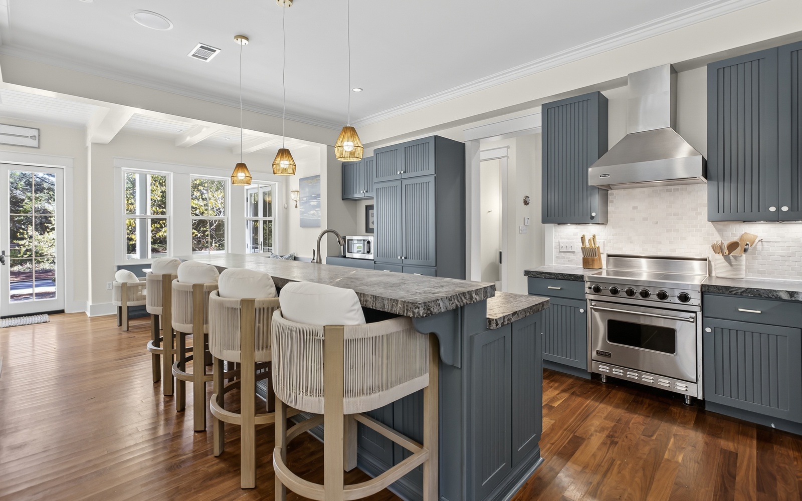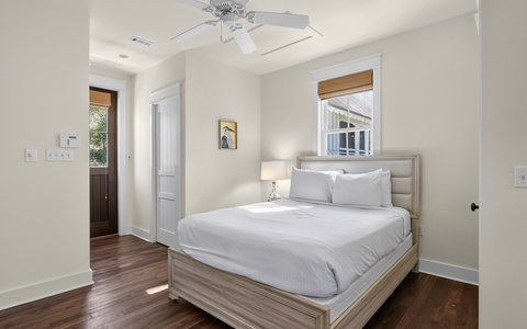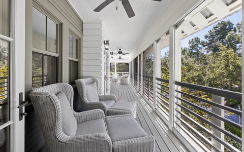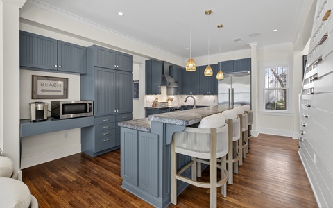 The front patio features rocking chairs, a small couch, a table and chairs, and ceiling fans– the perfect spot to unwind. Inside, the main level offers spacious, inviting areas for gathering and dining, plus a fully equipped kitchen and king bedroom. Upstairs, you’ll find beautifully appointed suites with private balconies, while the third and fourth floors bring fun and views with gaming, mini kitchen, and rooftop seating.