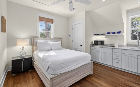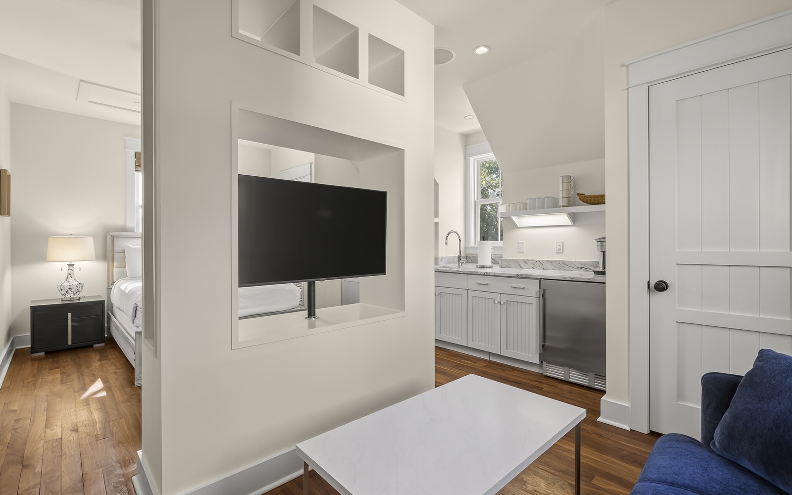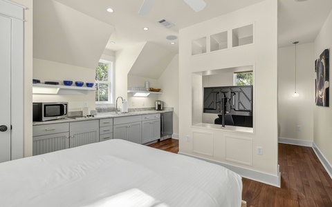 - Queen bedroom in carriage house; mini kitchen; full bathroom; mini living room; TV