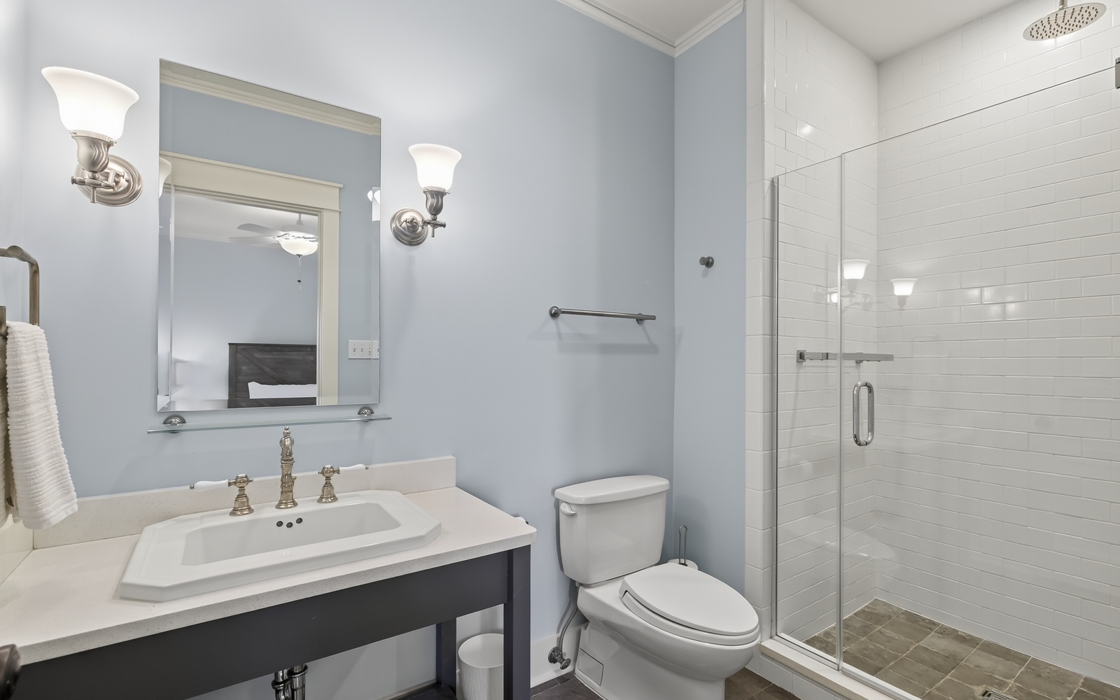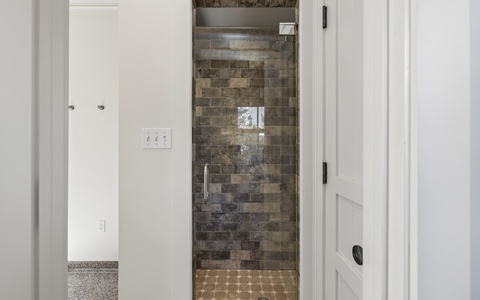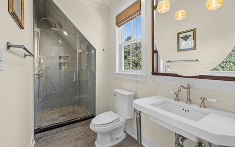 - King in 2nd floor guest room; shared bathroom with walk in shower; TV