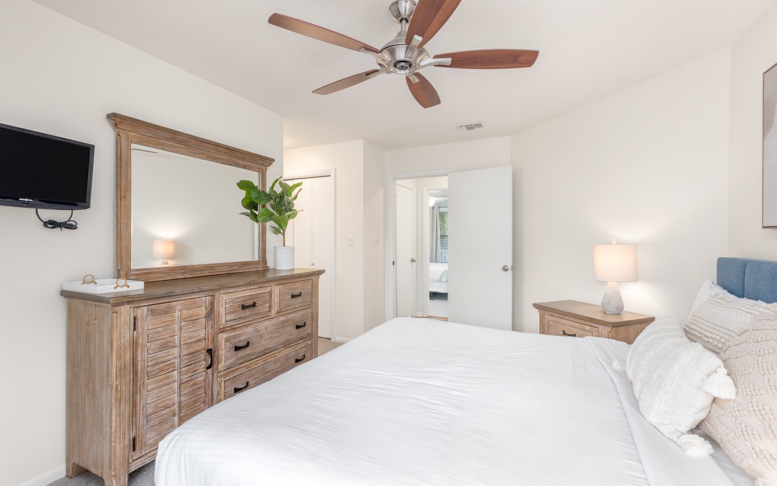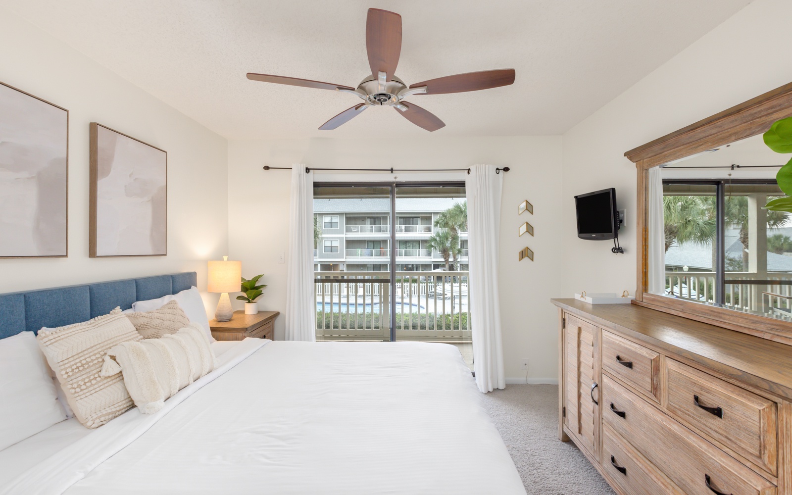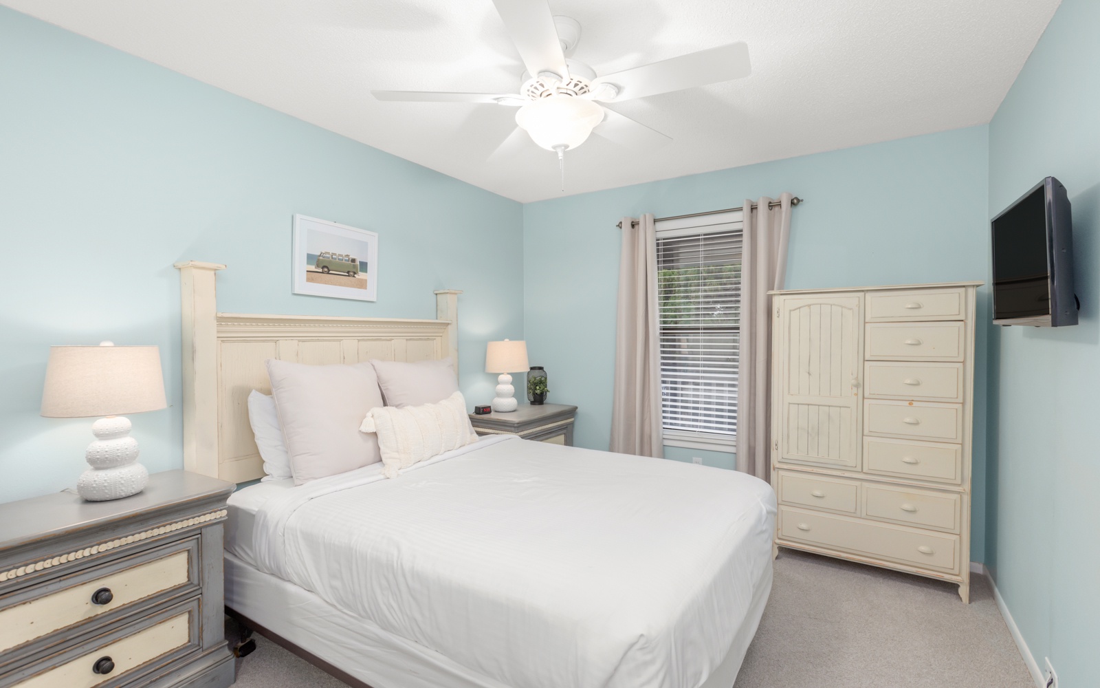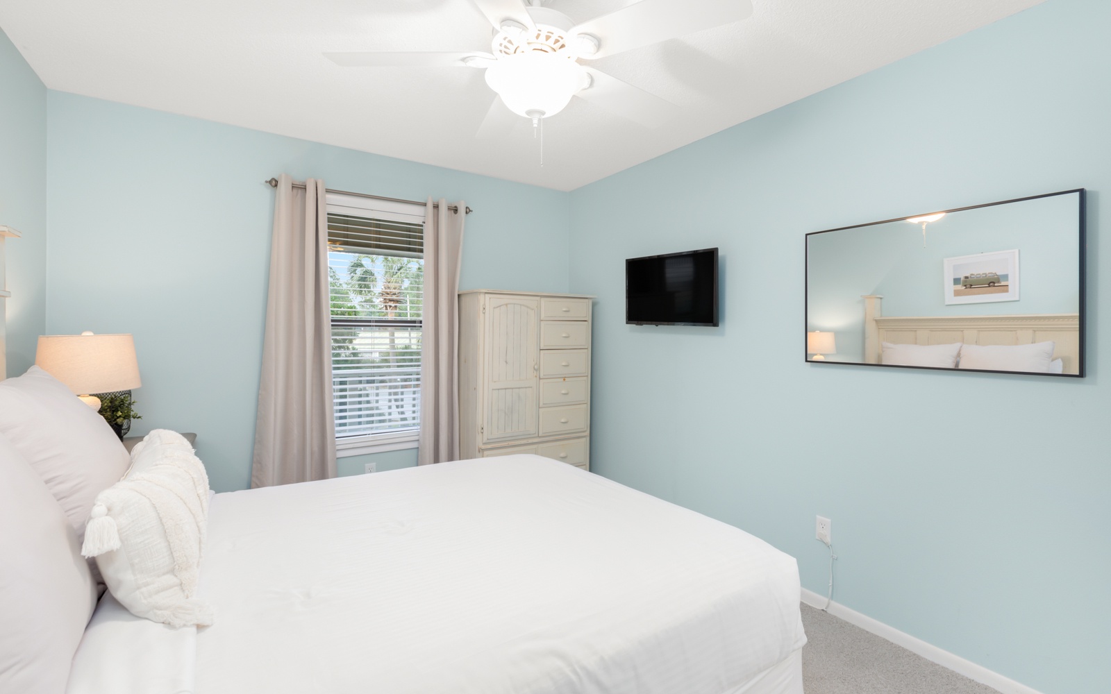 The primary bedroom, king, and guest room, queen, are tucked in the back.