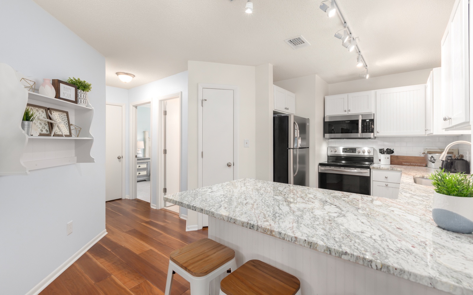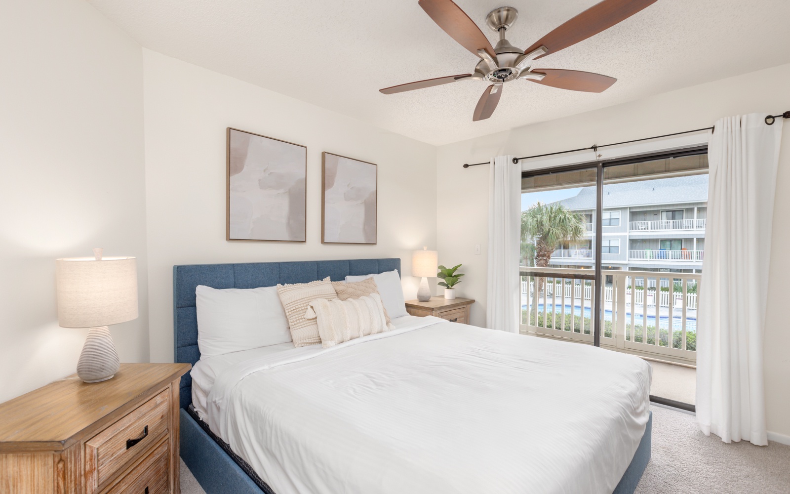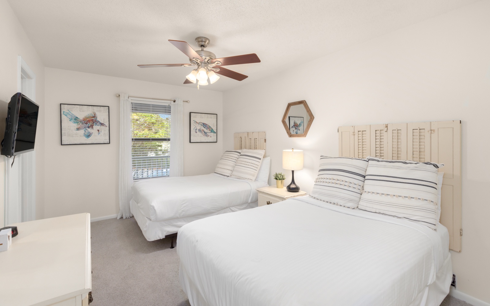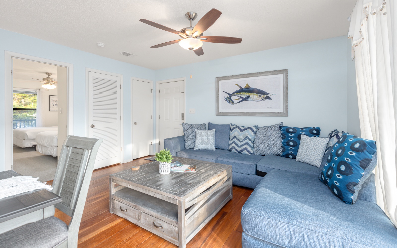 The primary bedroom, king, and guest room, queen, are tucked in the back.