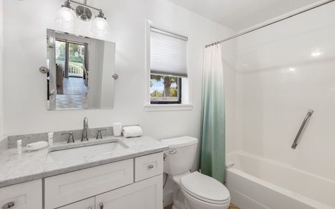 The living area has seating for entertaining as well as a bunk bed with two oversized twin beds. Off of the living room is a porch with seating for four to enjoy the outdoors. The kitchen has a large counter space making prepping for meals a breeze. The master bedroom features a king bed and across the hall you will find the shared bath.