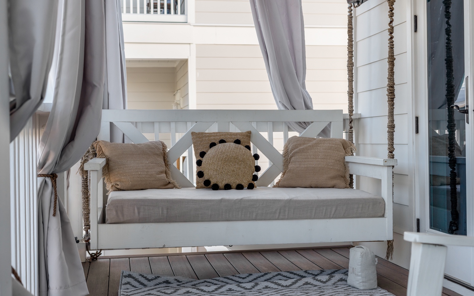 Inside, five bedrooms and three-and-a-half baths keep everyone comfy. The second-floor living space opens onto a balcony with two bed swings, which have been known to steal entire afternoons. Exterior stairs lead straight to the pool deck for quick dips or snack refills.