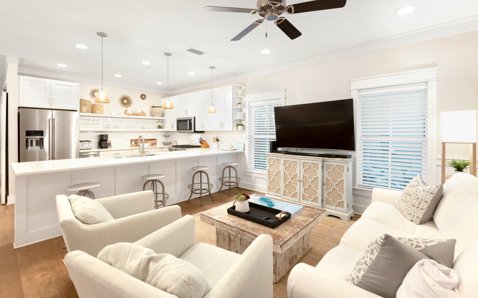 Inside, the open living area is spacious and inviting, with plush seating and a large TV. The kitchen includes commercial-grade appliances and all the tools you need.