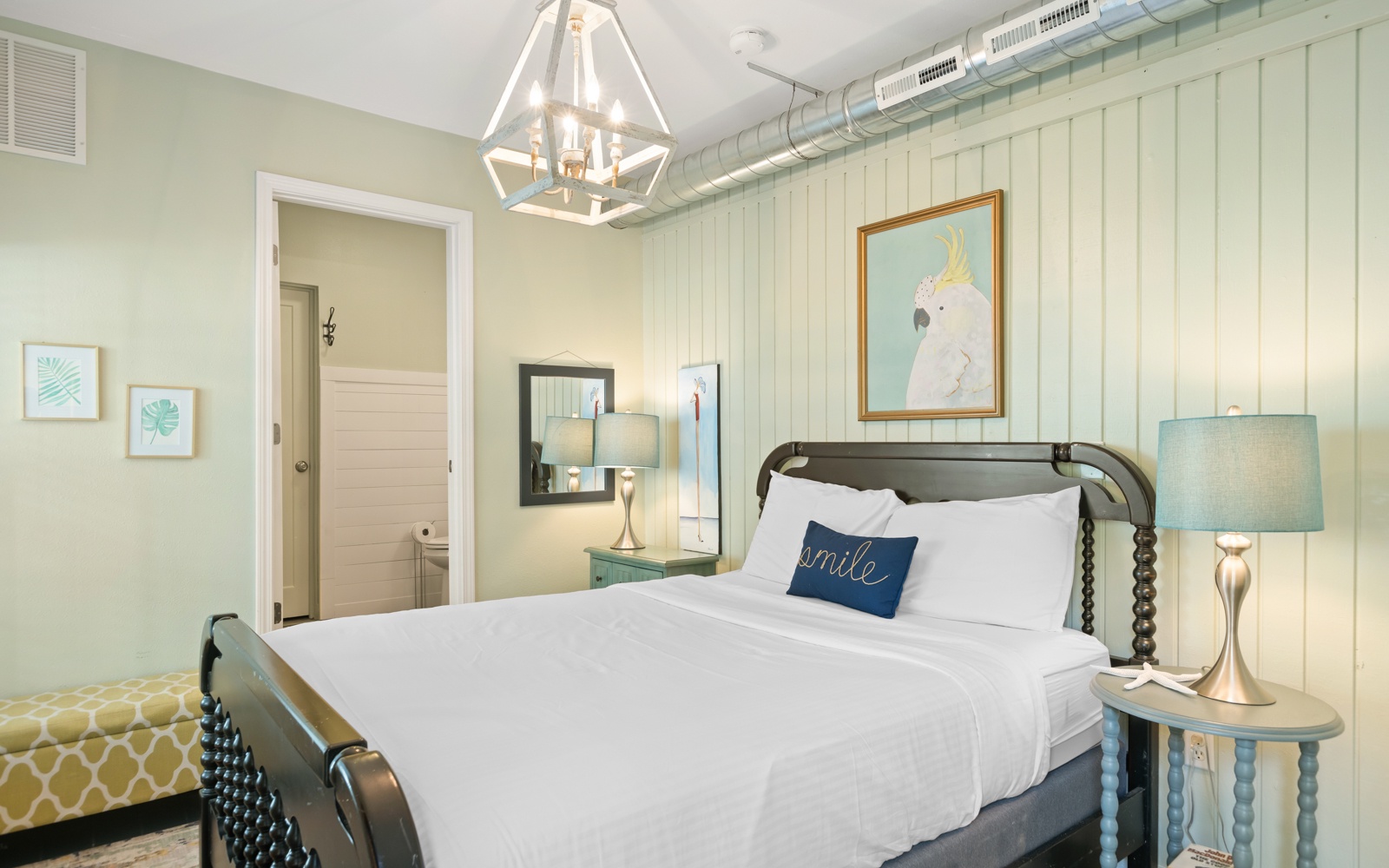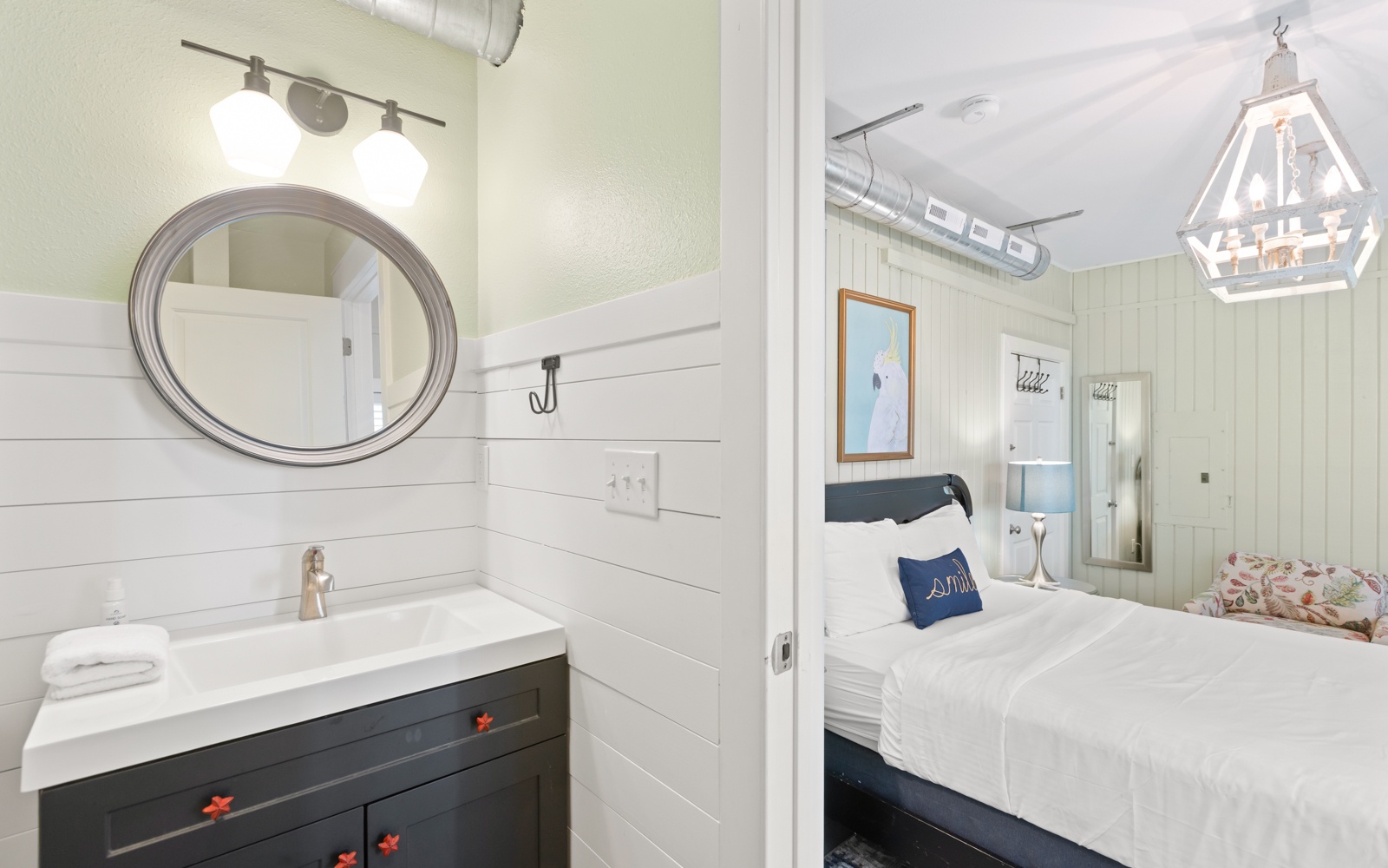 When arriving at the home, a pathway on the left will lead you to the exterior door for the ground-level bedroom. This guest room, queen, has a TV and a private bathroom with a shower.