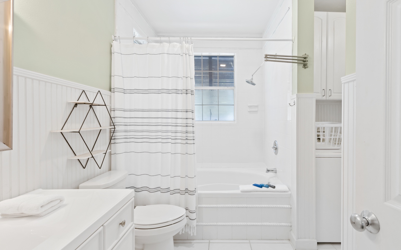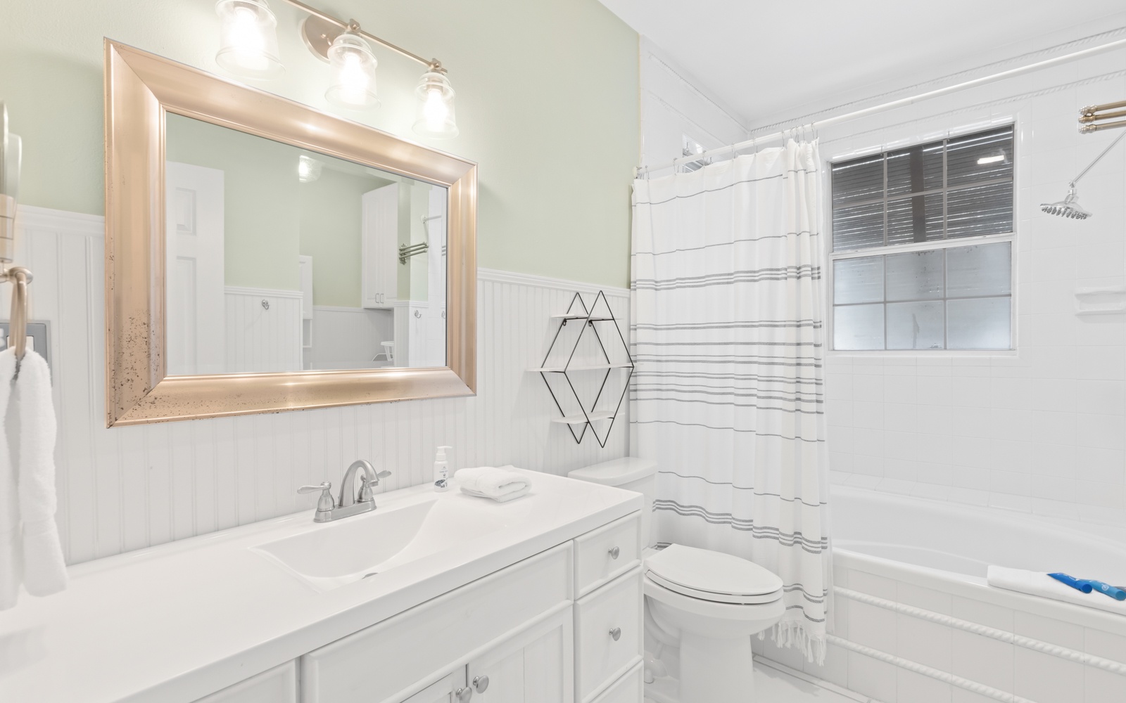 Nearby is a primary bedroom, king, and en suite bath, with a large tub/shower combo. A bonus feature is an available garage, a space perfect for storing bikes, beach chairs, and sandy toys.