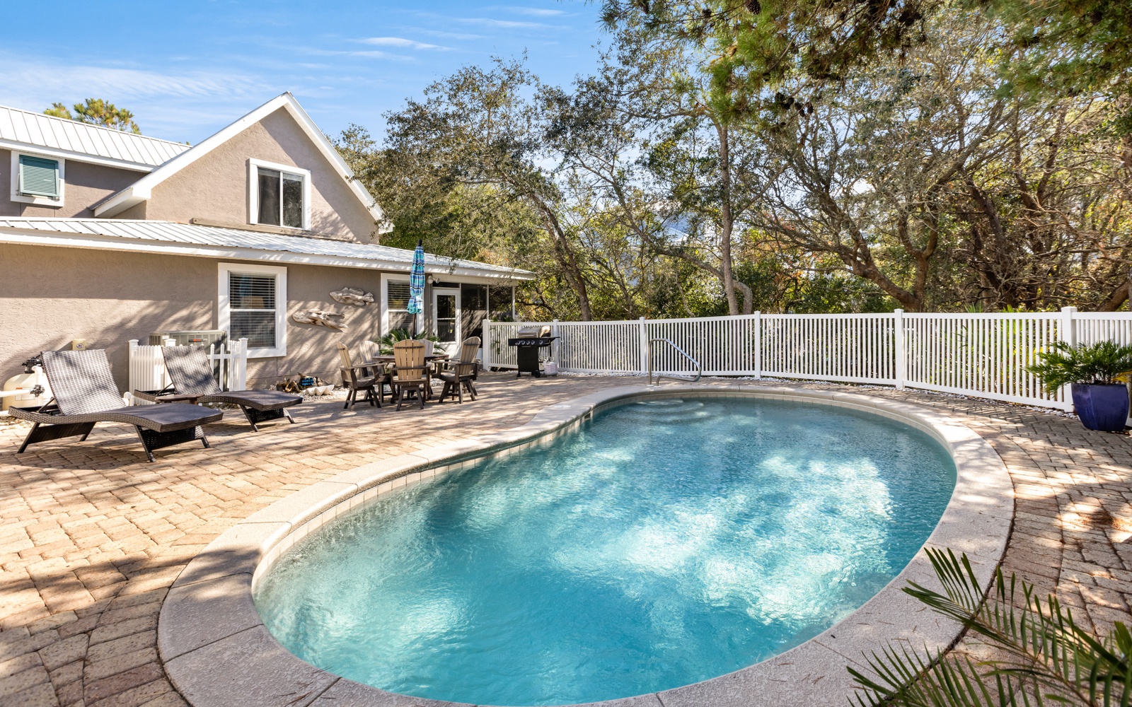 Take a short three-minute walk to the nearby beach access or spend the day splashing around in the private backyard pool. The woodsy back patio is perfect for family gatherings, with lounge chairs for the whole family.