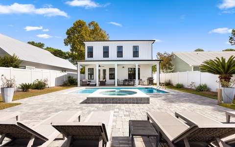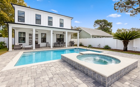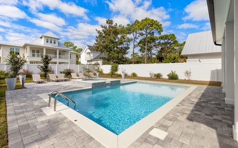 Speaking of the backyard, get ready to indulge. A stunning pool and spa spill into each other, creating the ultimate spot for poolside lounging, spa relaxation, or dining under the stars.