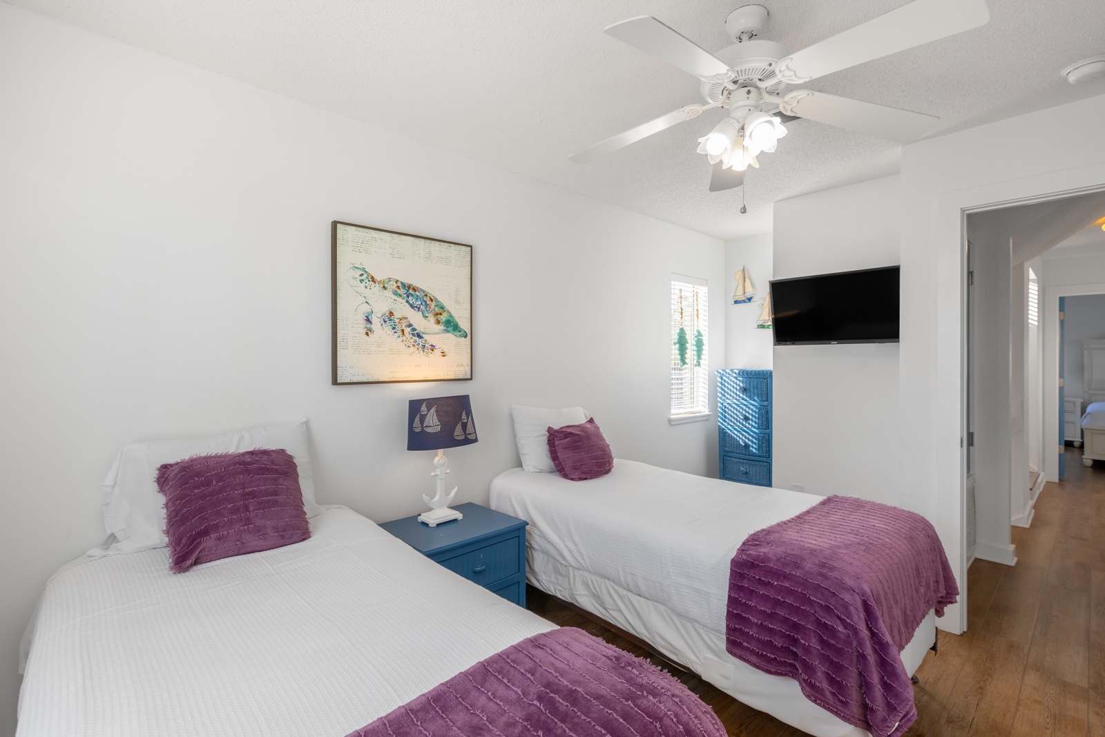 - 2 twins in 2nd story guest room; shared hallway bath