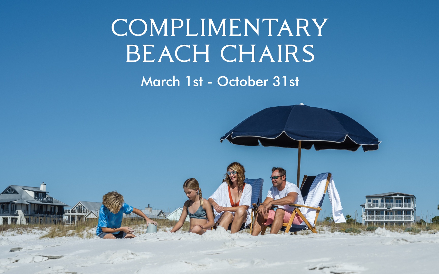 - Complimentary beach chairs and an umbrella (March 1st - October 31st)