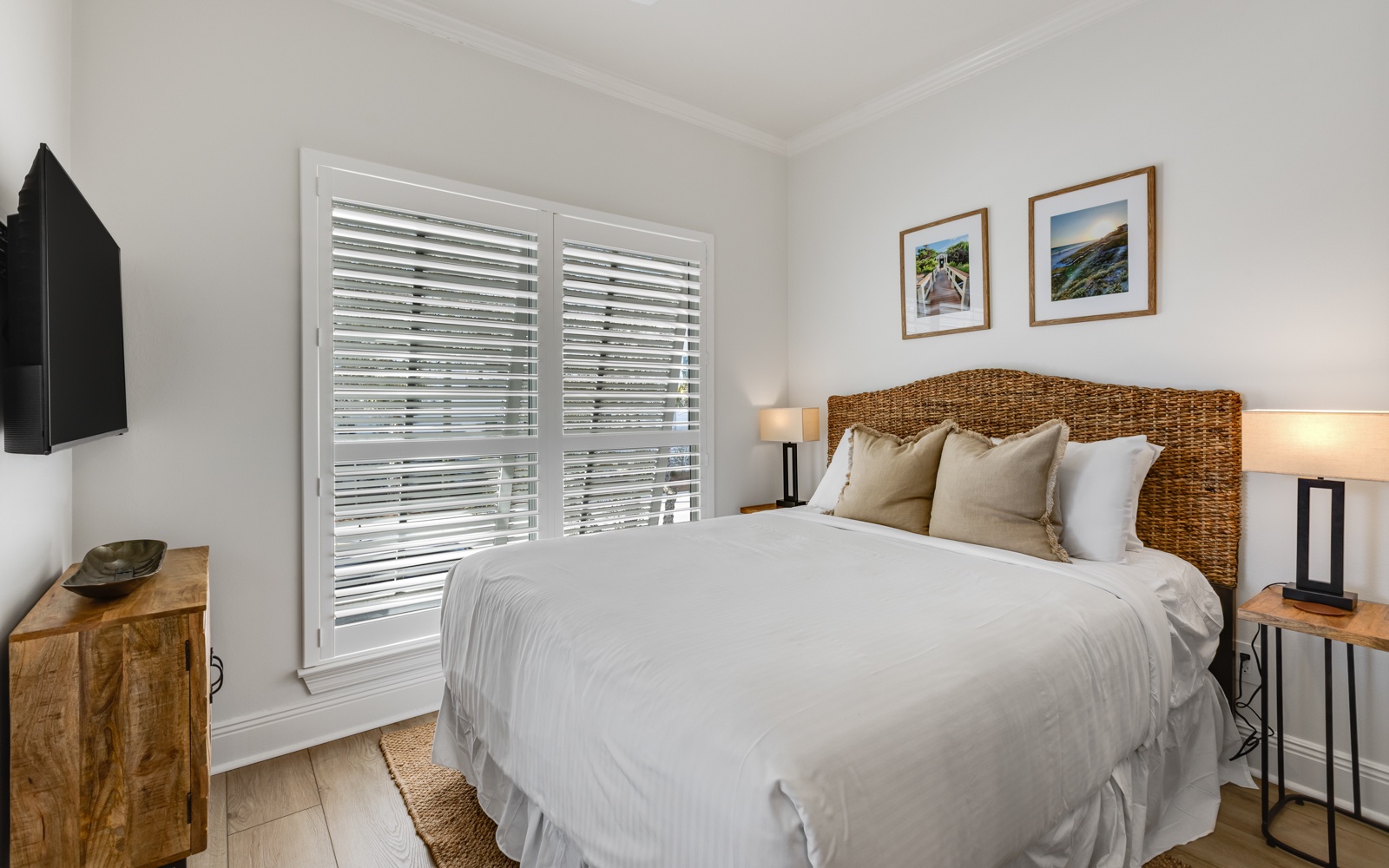 - Primary Bedroom: King bed, private en suite bath, private balcony, Smart TV
