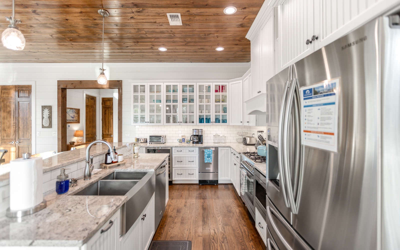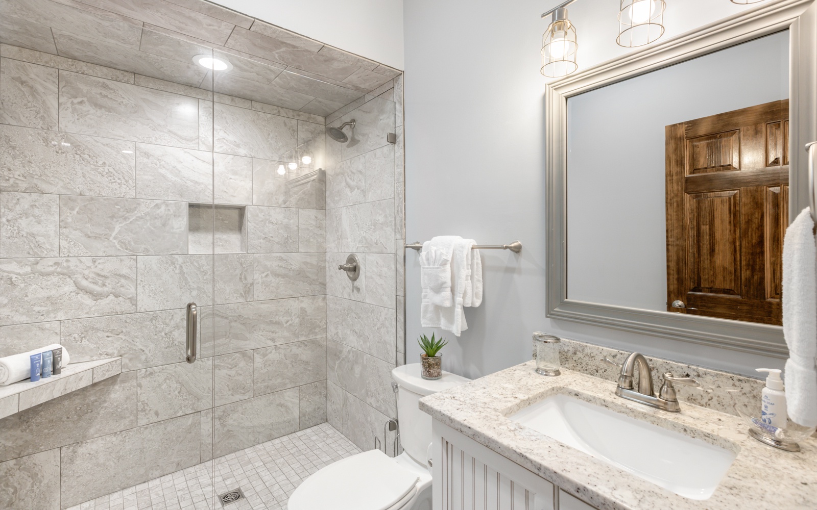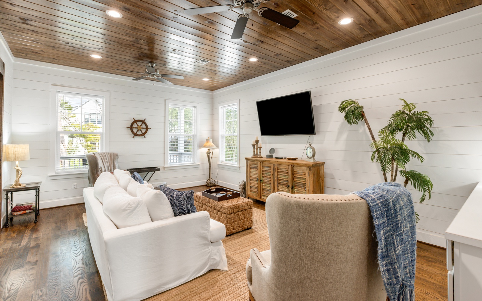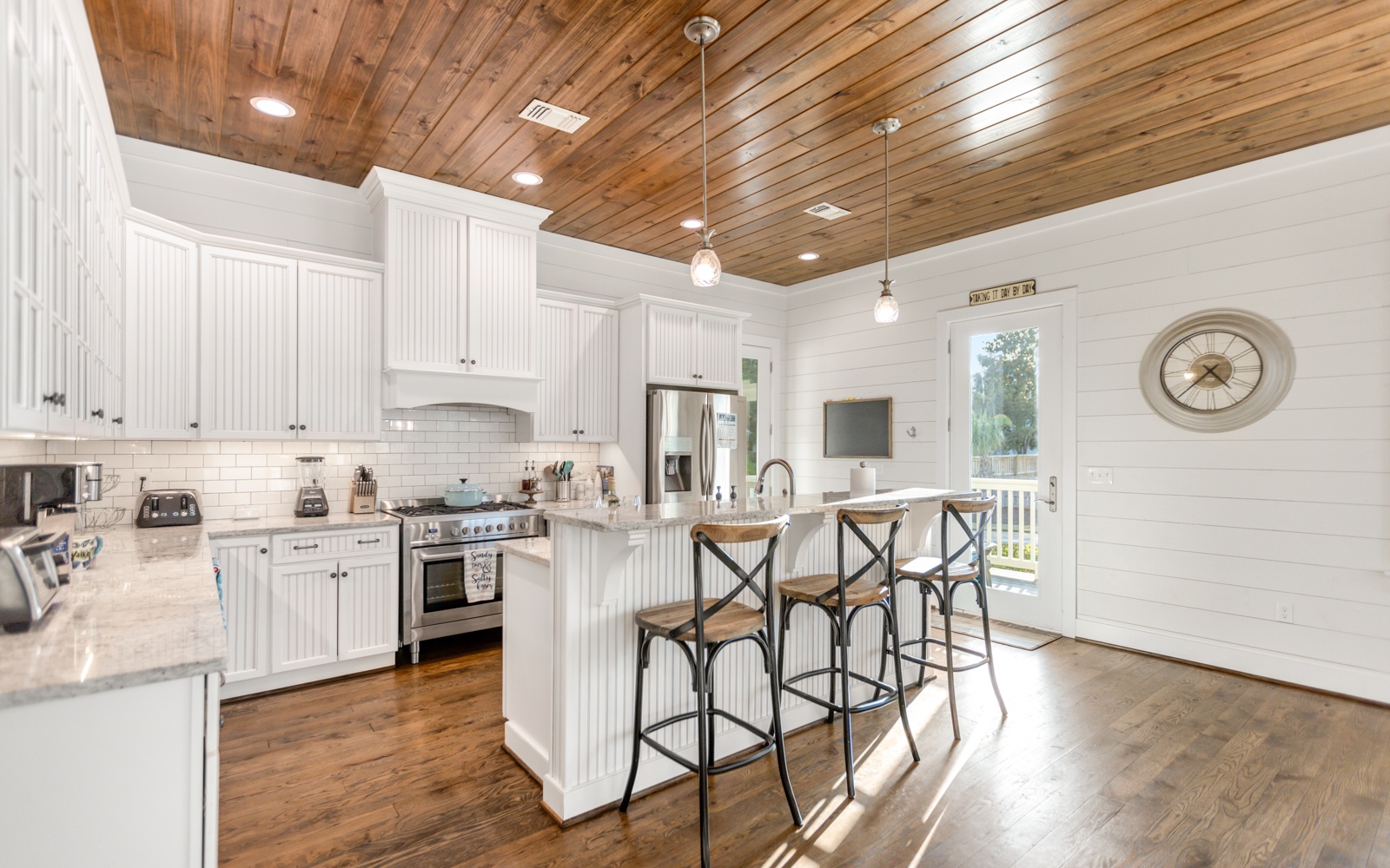 A home away from home, the ground floor’s amazing high-end chef’s kitchen, and large farm table is where everyone will gather. A delightful, large living room, with 60-inch TV, is also a great space to unwind.