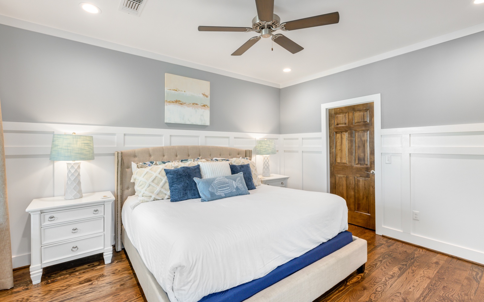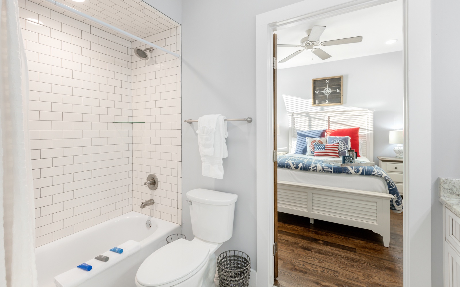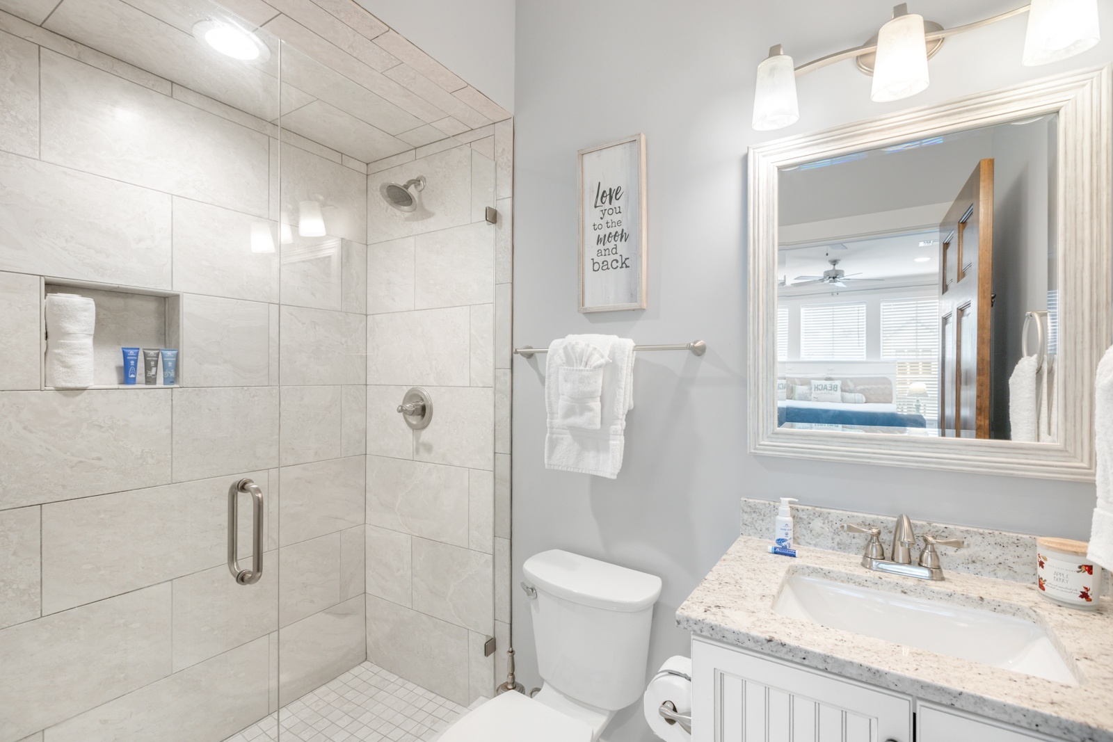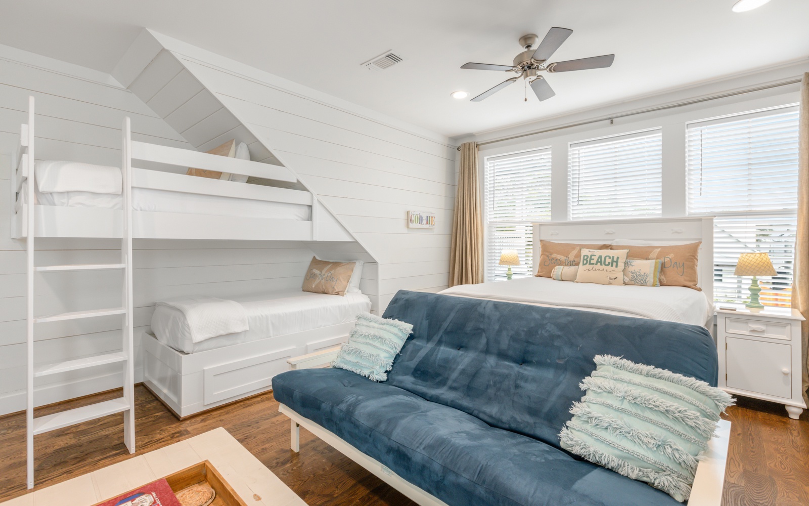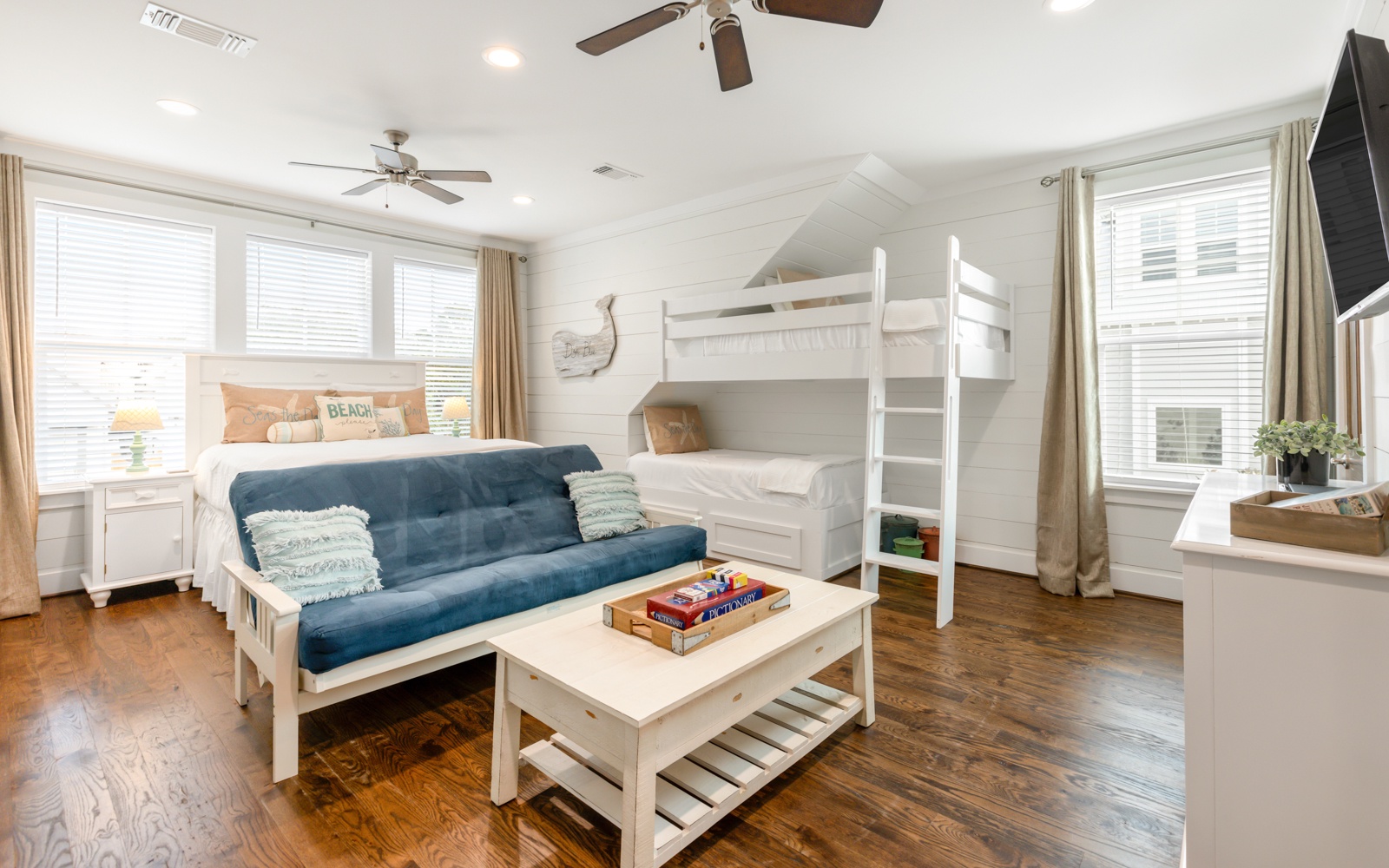 Upstairs, the primary bedroom, king, has a dual vanity, walk-in shower and tub. Down the hall, the first guest bedroom, king, shares the hall bath, and two additional guest bedrooms, queen, share a Jack and Jill bath. The third guest room has 2 twin bunk beds and a queen bed with private bath.
