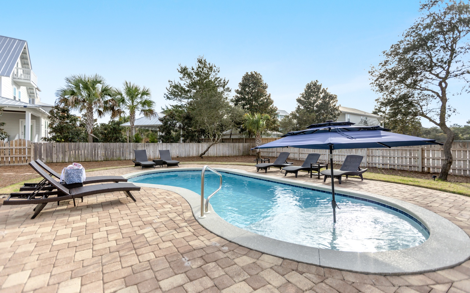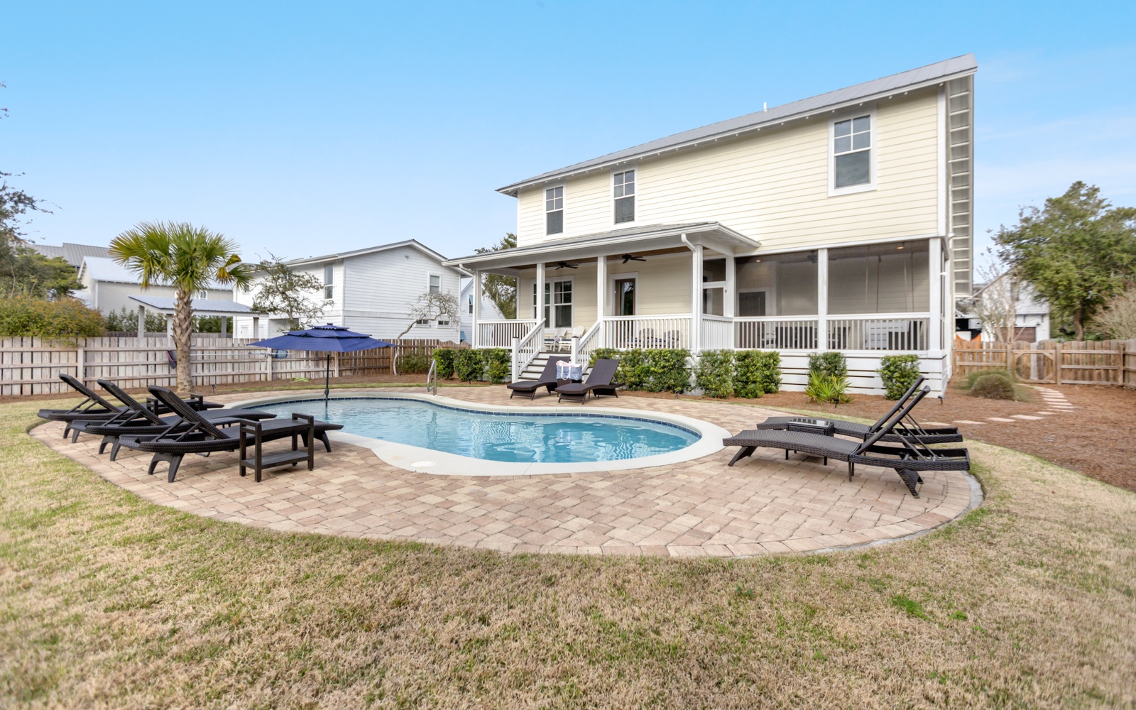 Directly out back is your own private paradise, with gorgeous porch, large private pool, and lounge chairs.