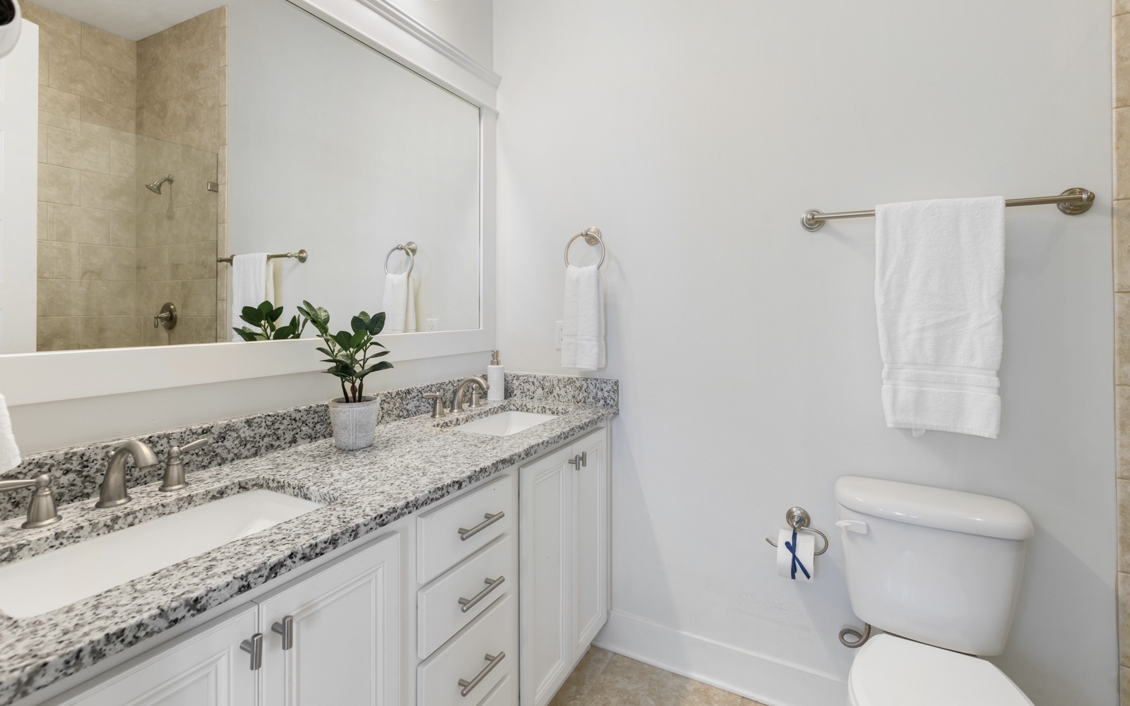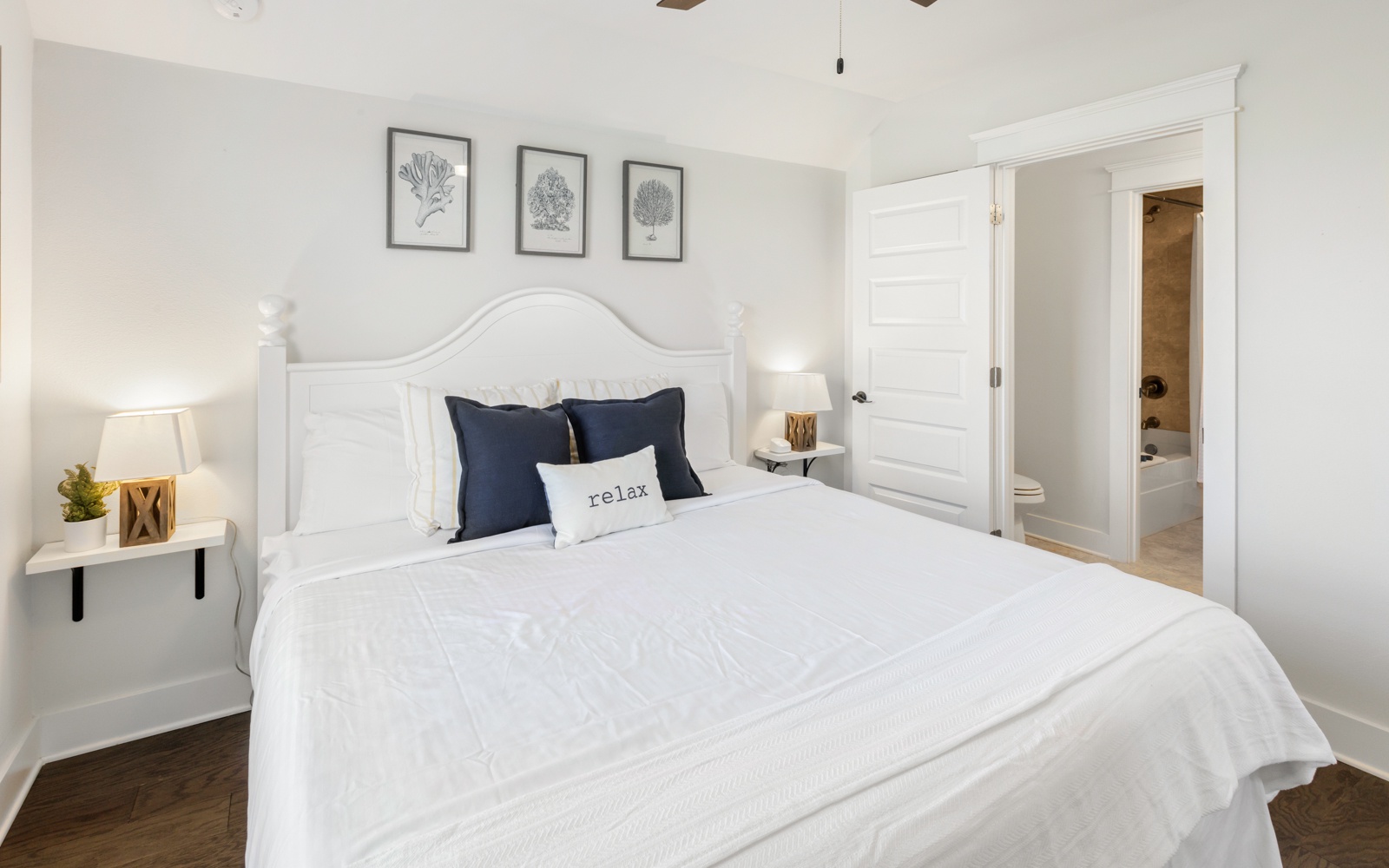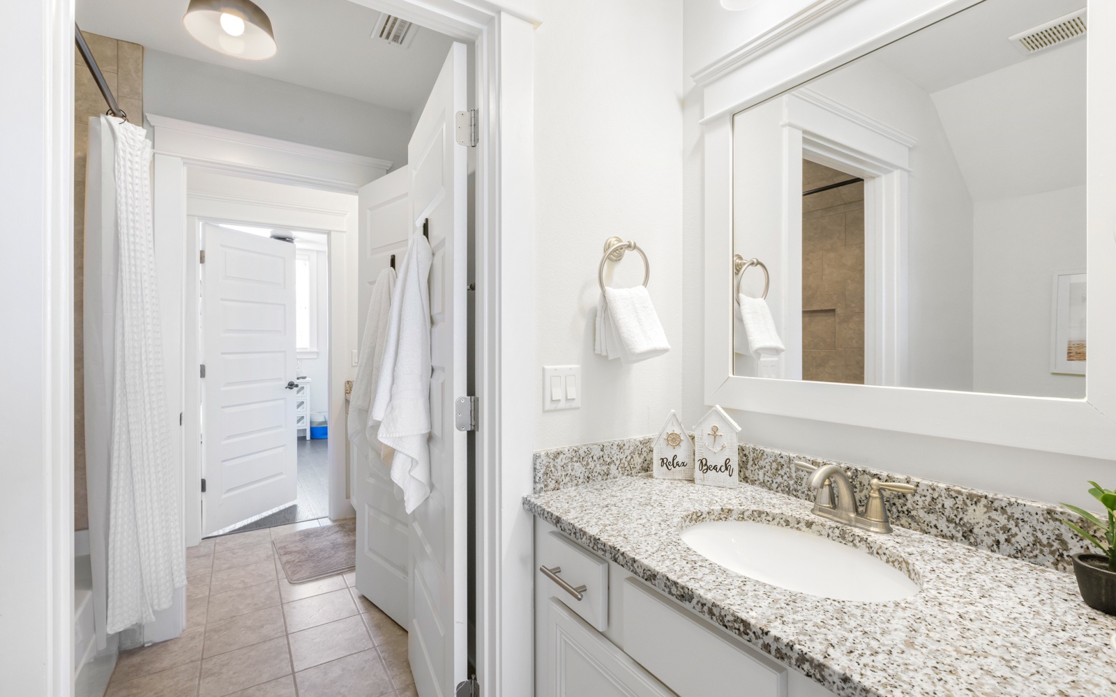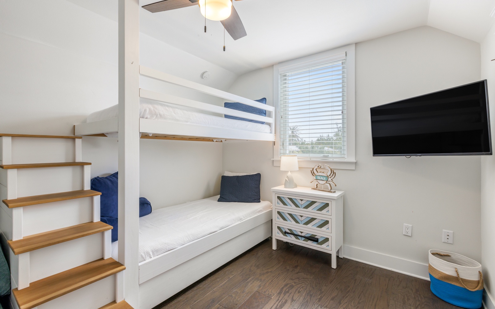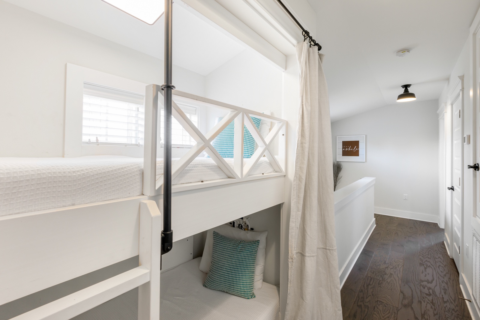 A primary bedroom, king, is on the first floor, with a private bath and walk-in shower. Upstairs, are two guest rooms, one with a king, the other with a twin/twin bunk bed and trundle bed. These rooms share a bathroom with a tub and shower combo. Additionally, there's a unique custom built-in twin/twin bunk nook in the hallway that's perfect for kids or extra guests.