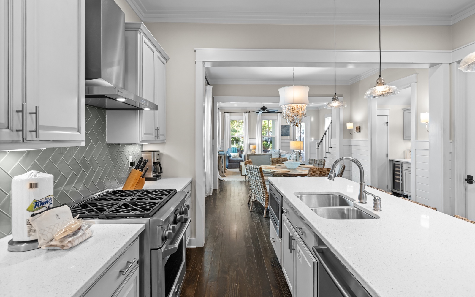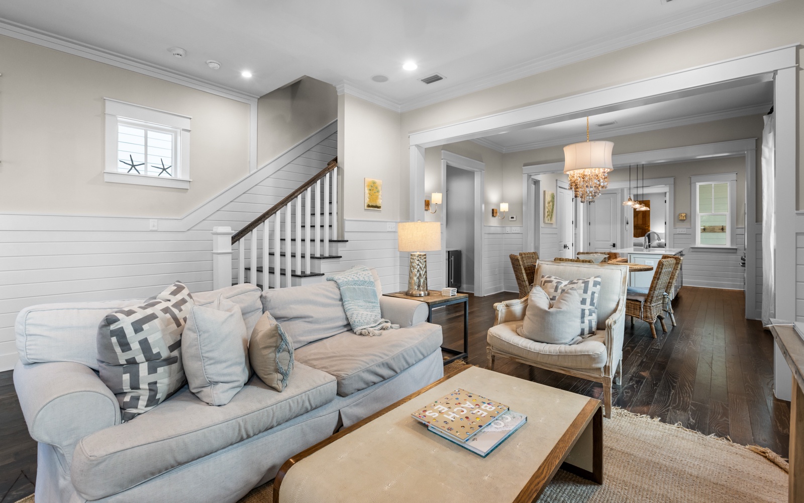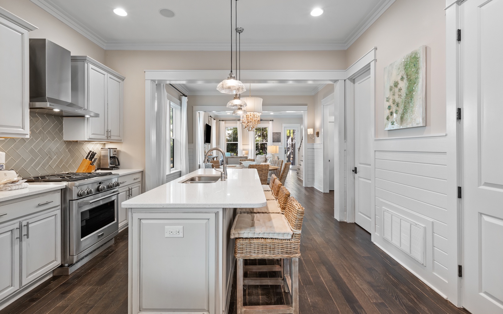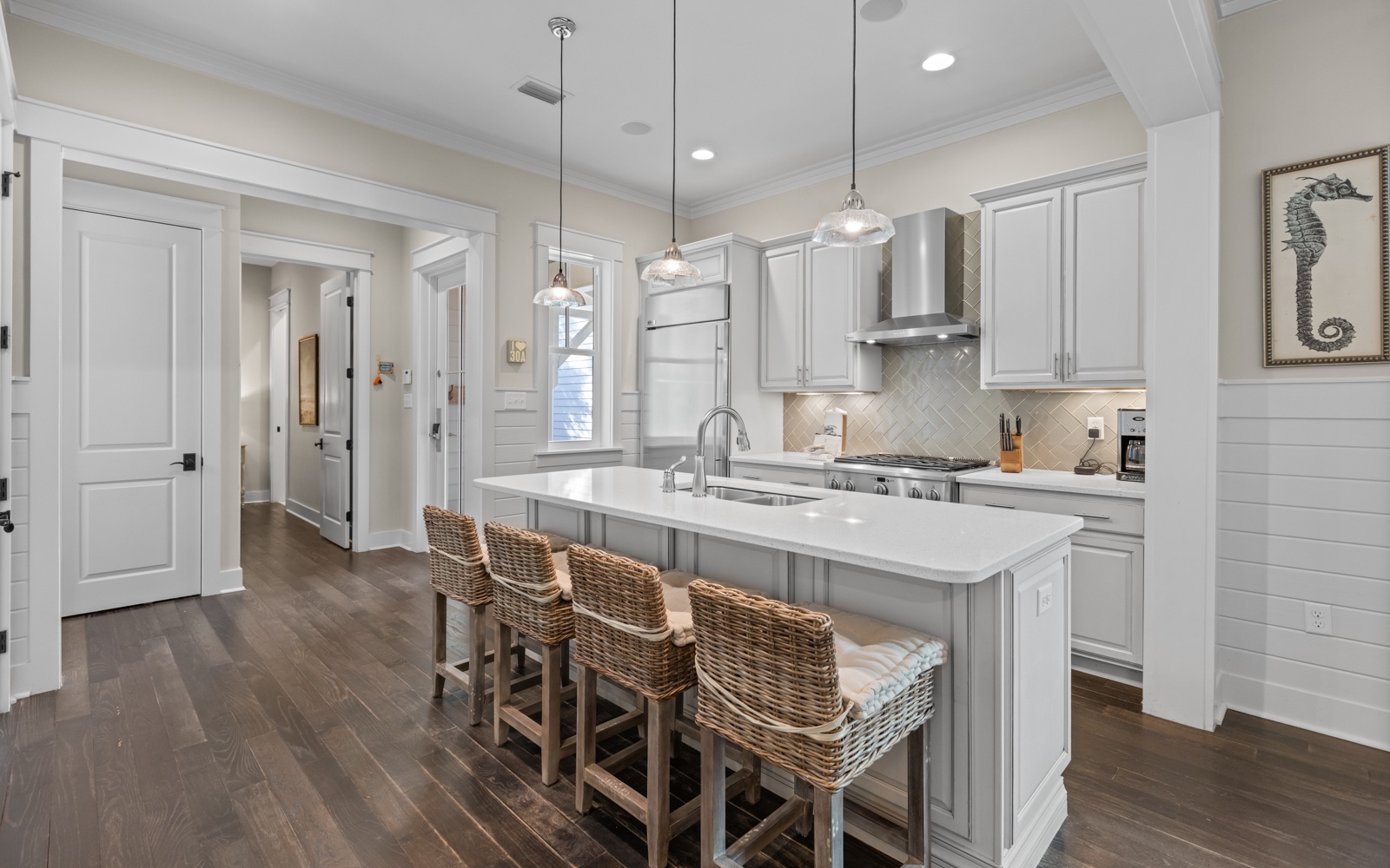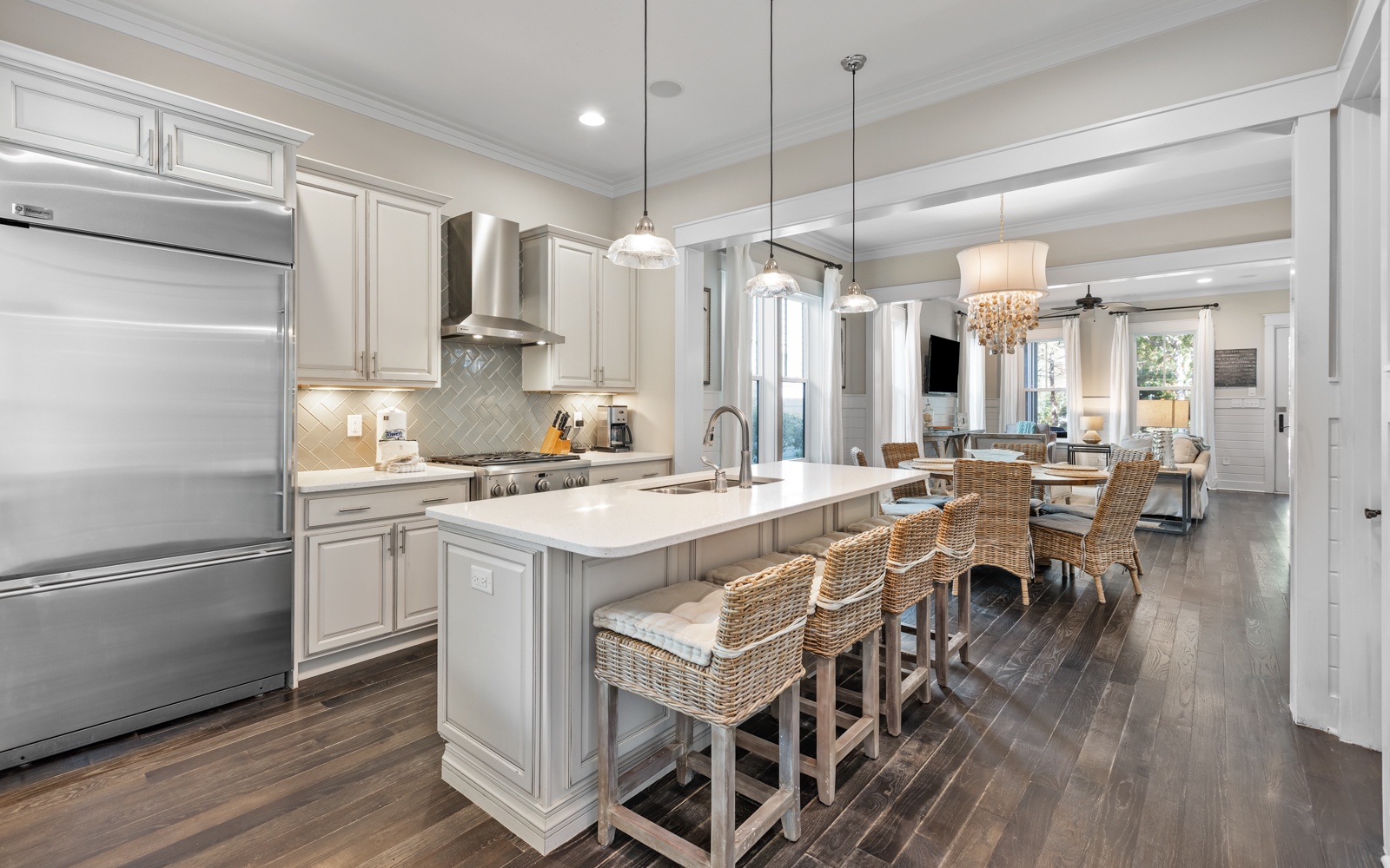 Inside, the main level sets an easy rhythm with generous gathering space, a dry bar stocked with a wine fridge and ice maker, and a chef-friendly kitchen with premium appliances and a large island built for conversation. Dark hardwood floors and white shiplap keep things crisp and coastal.