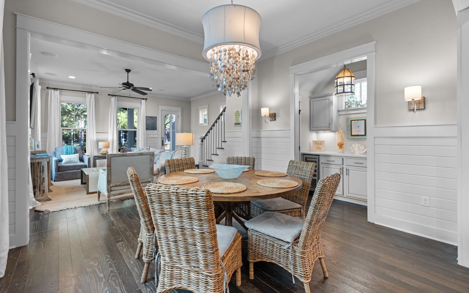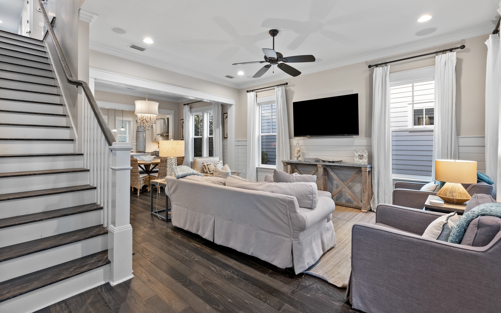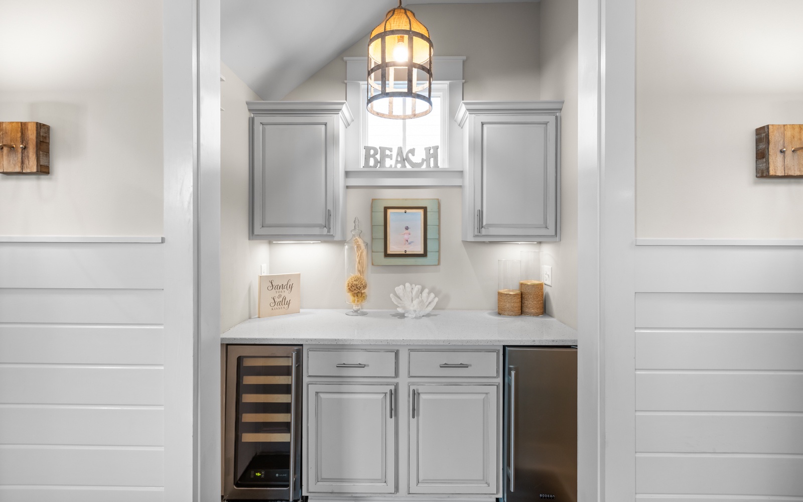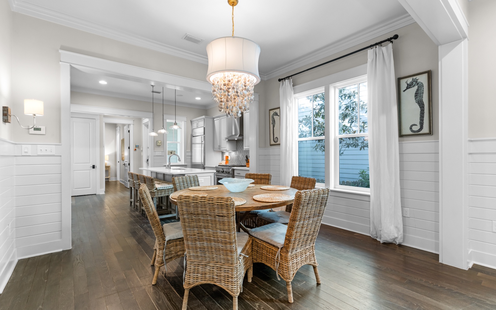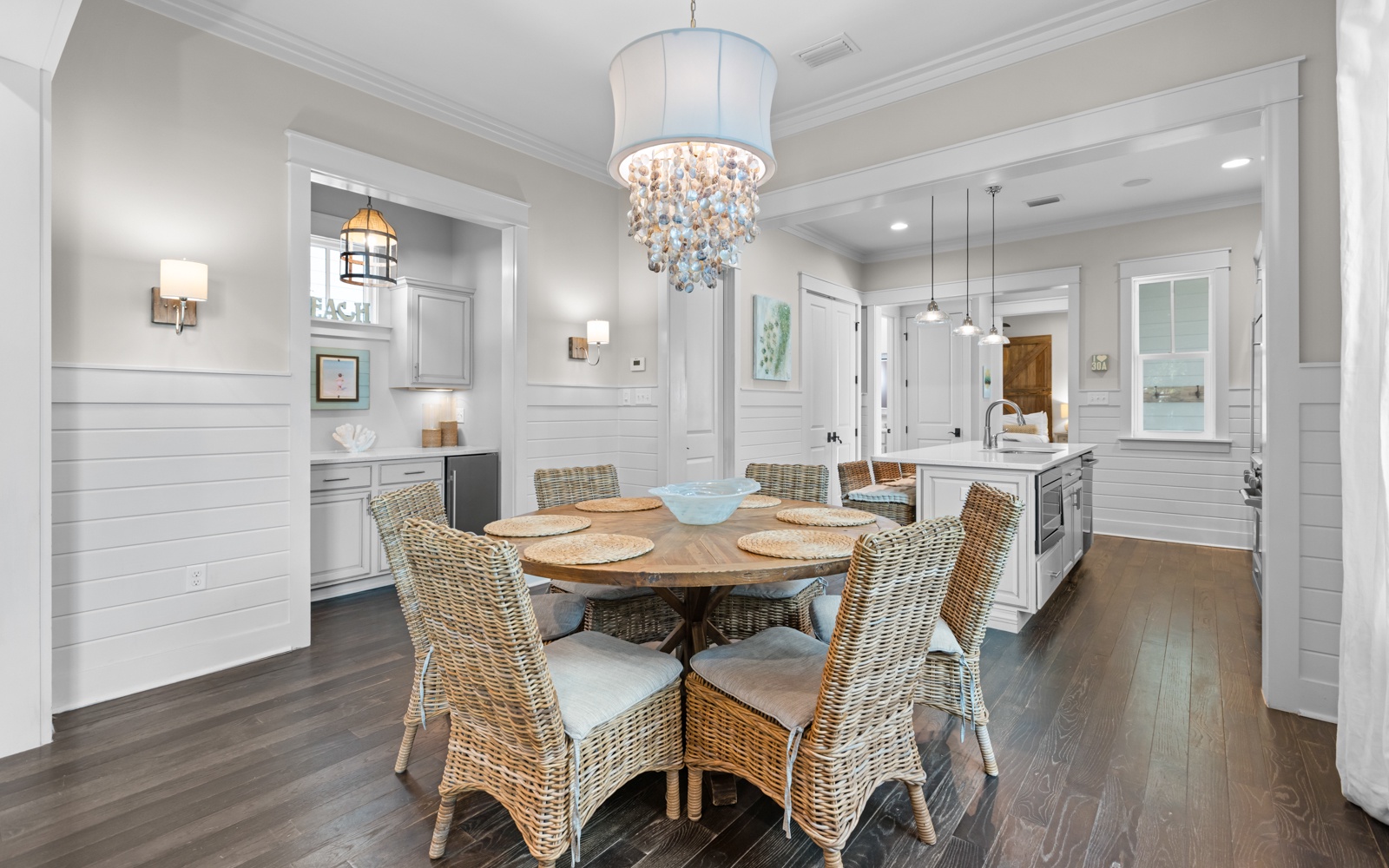 Inside, the main level sets an easy rhythm with generous gathering space, a dry bar stocked with a wine fridge and ice maker, and a chef-friendly kitchen with premium appliances and a large island built for conversation. Dark hardwood floors and white shiplap keep things crisp and coastal.