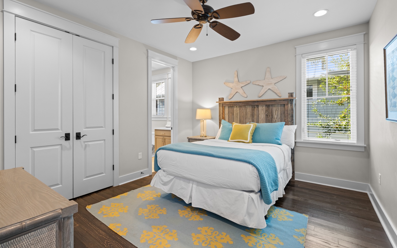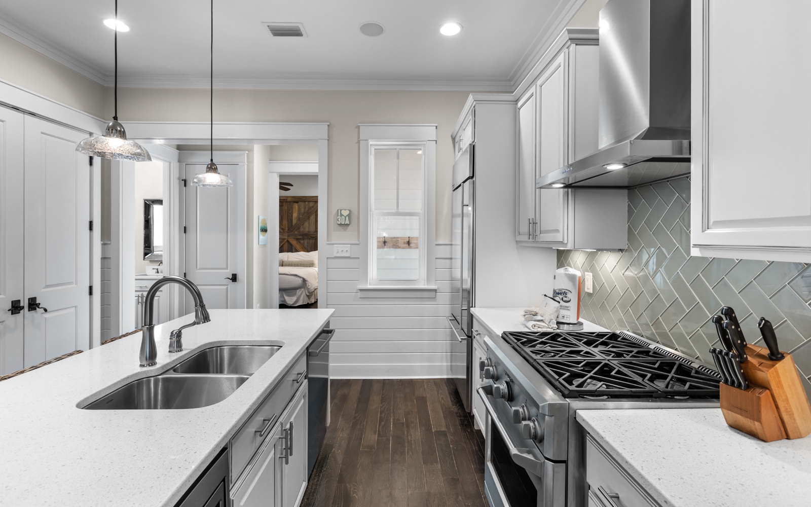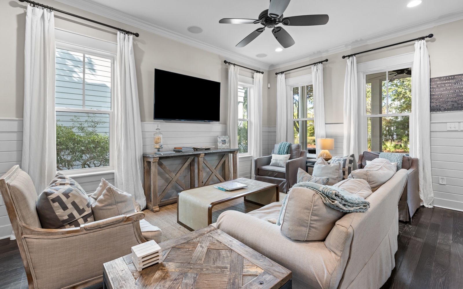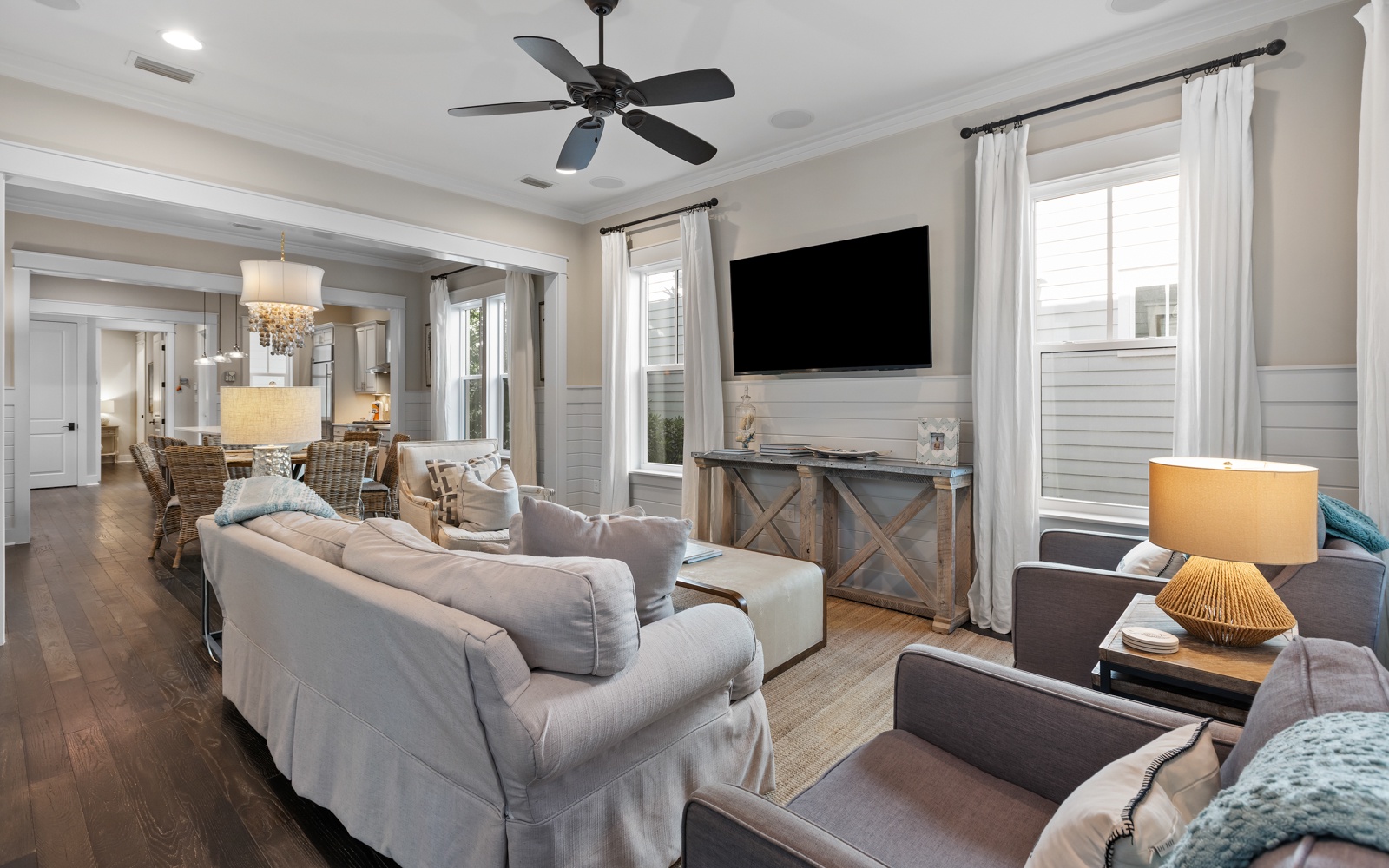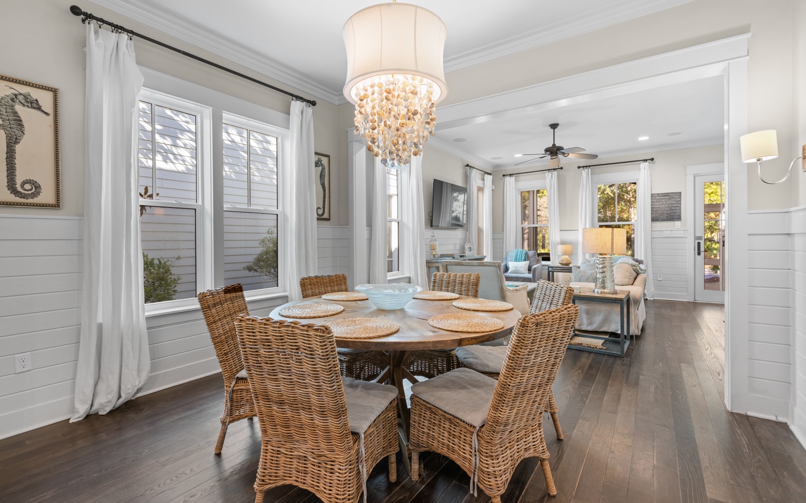 Inside, the main level sets an easy rhythm with generous gathering space, a dry bar stocked with a wine fridge and ice maker, and a chef-friendly kitchen with premium appliances and a large island built for conversation. Dark hardwood floors and white shiplap keep things crisp and coastal.