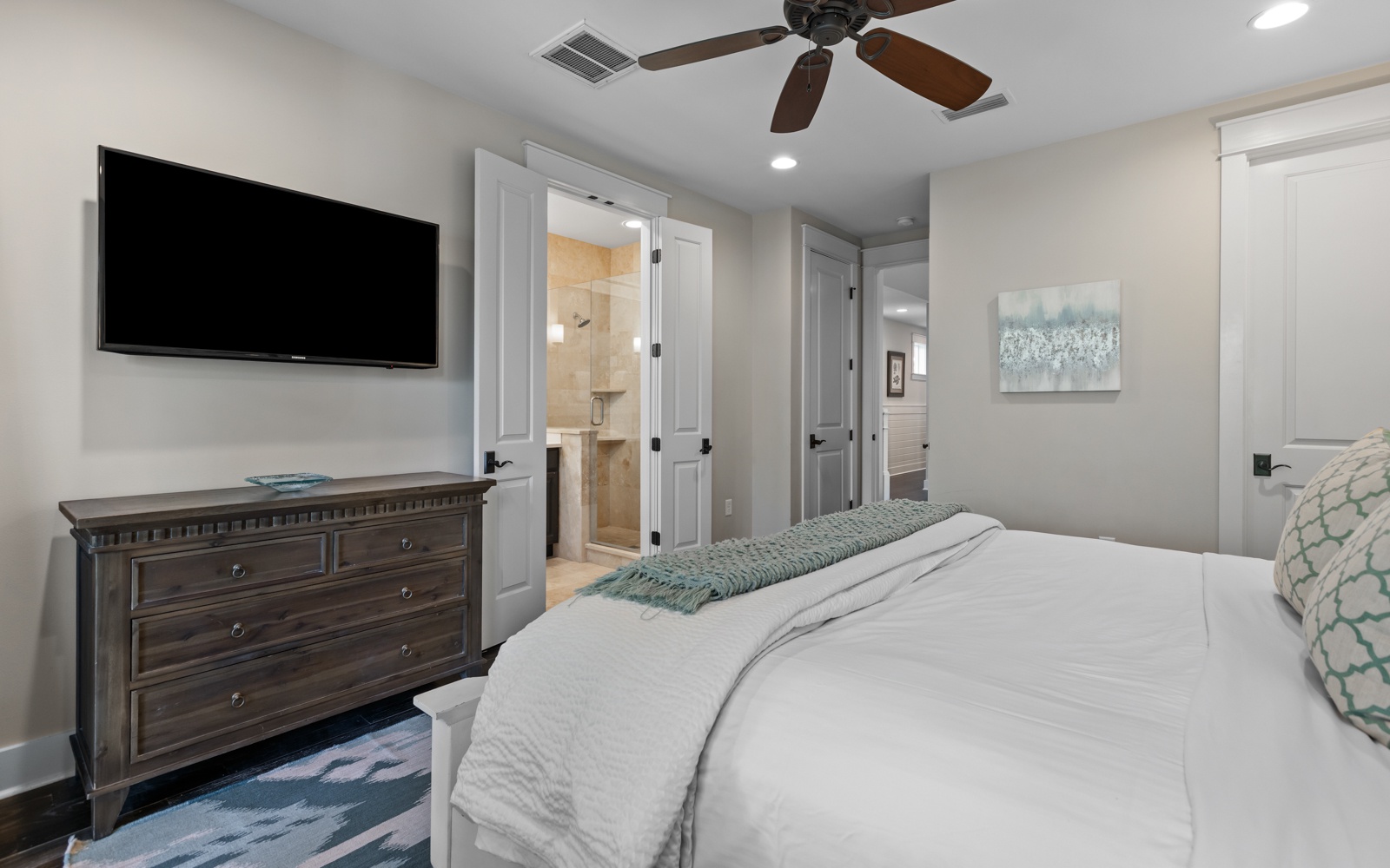 - Guest Bedroom: King bed, shared bathroom, shower, TV