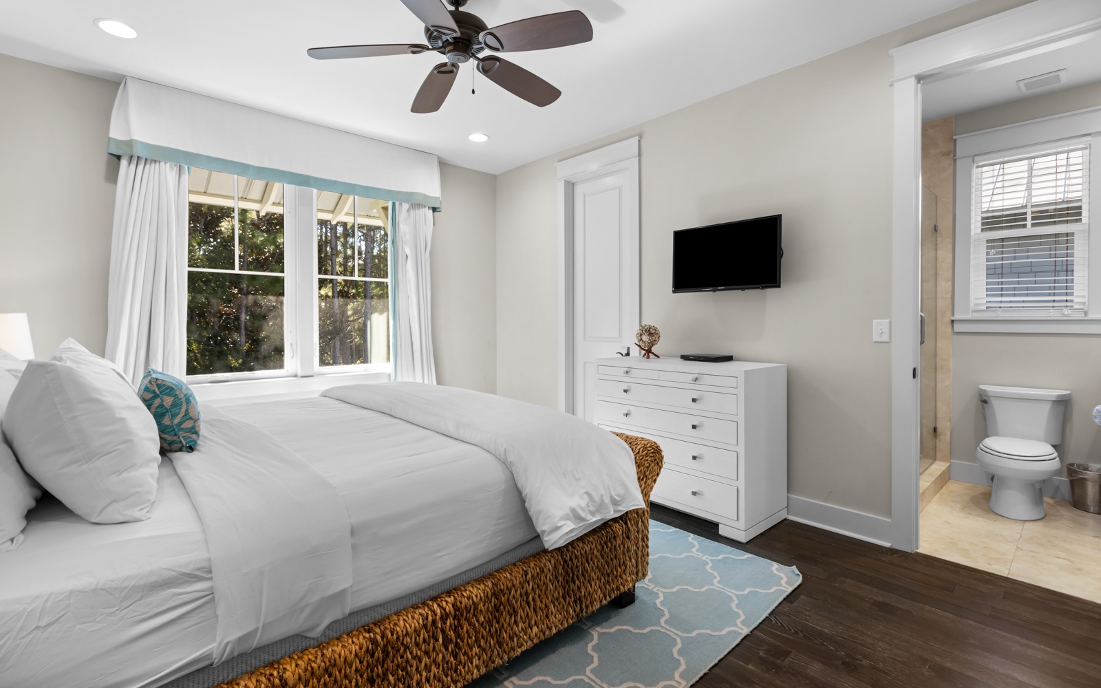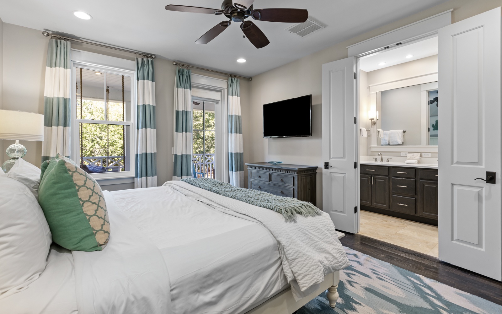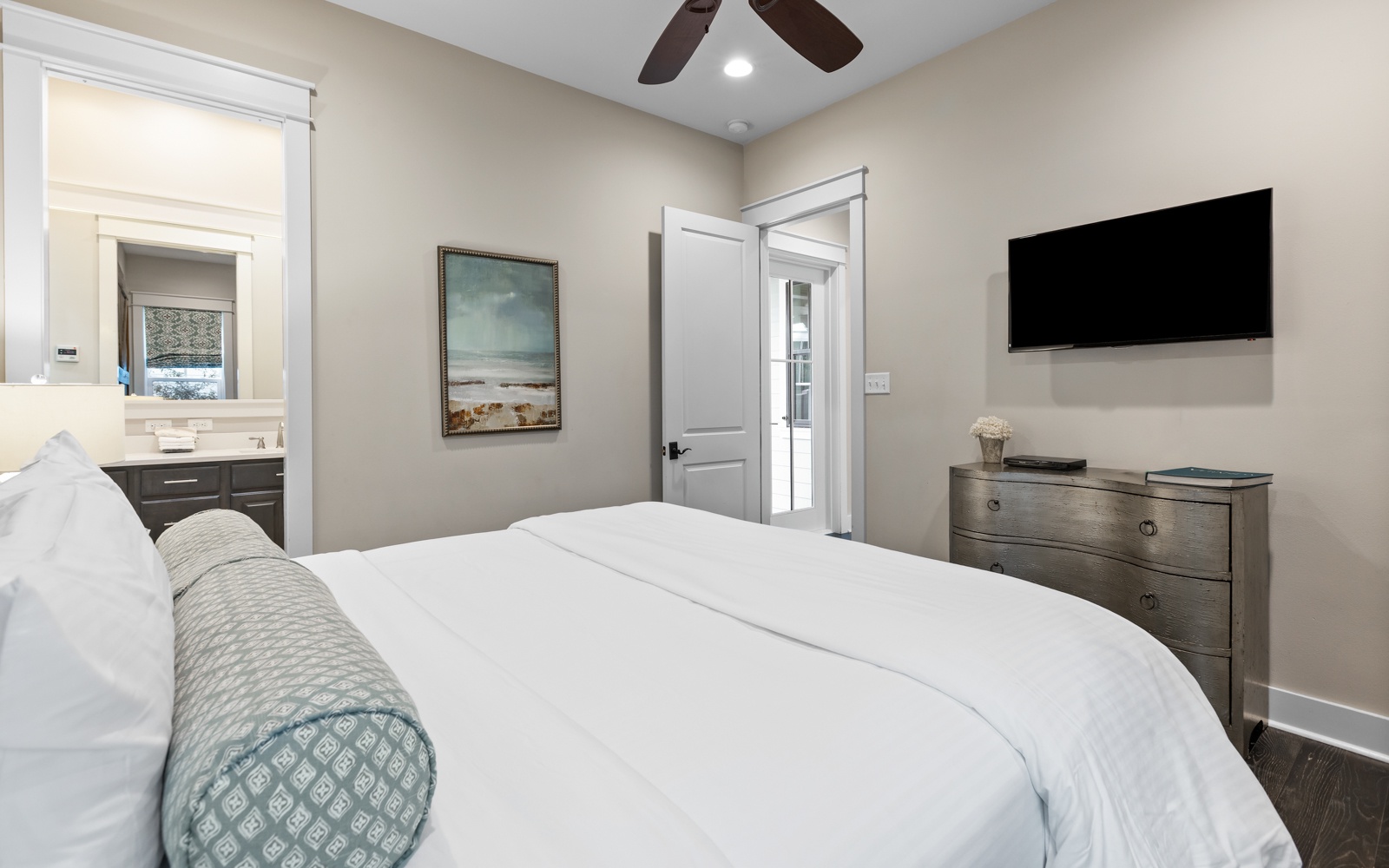 - Primary Bedroom: King bed, private bathroom, shower, Private Balcony, TV