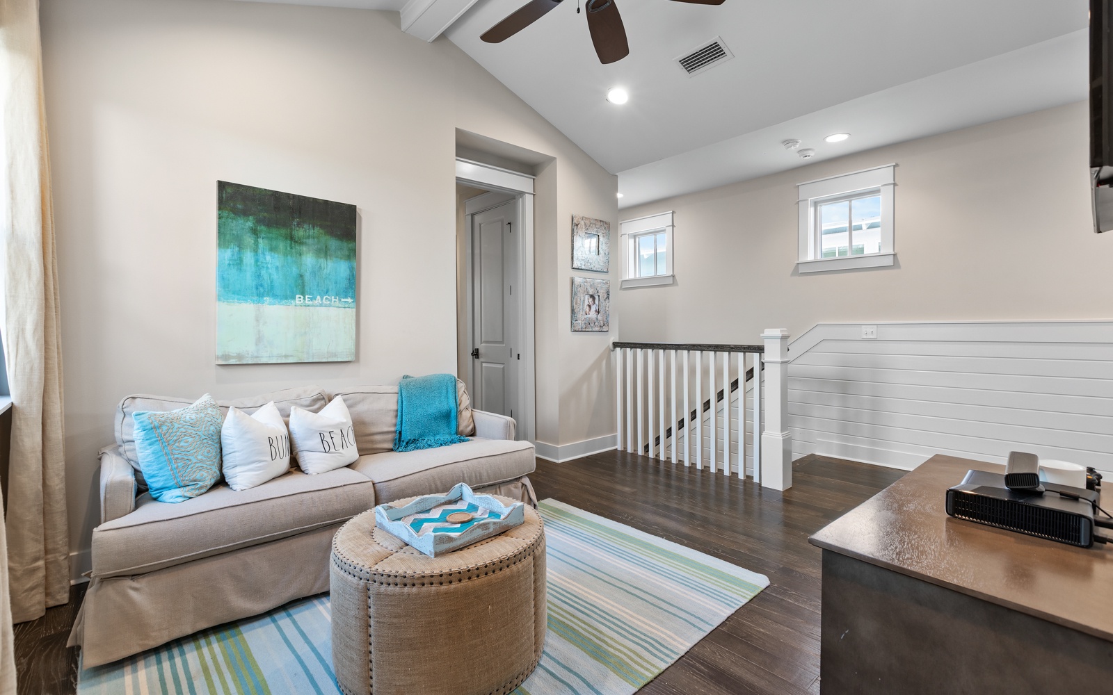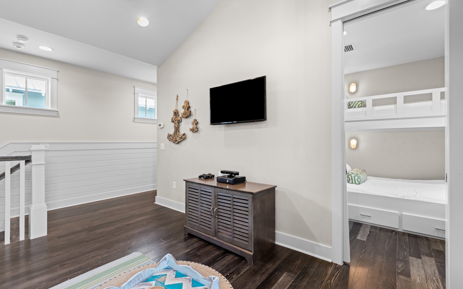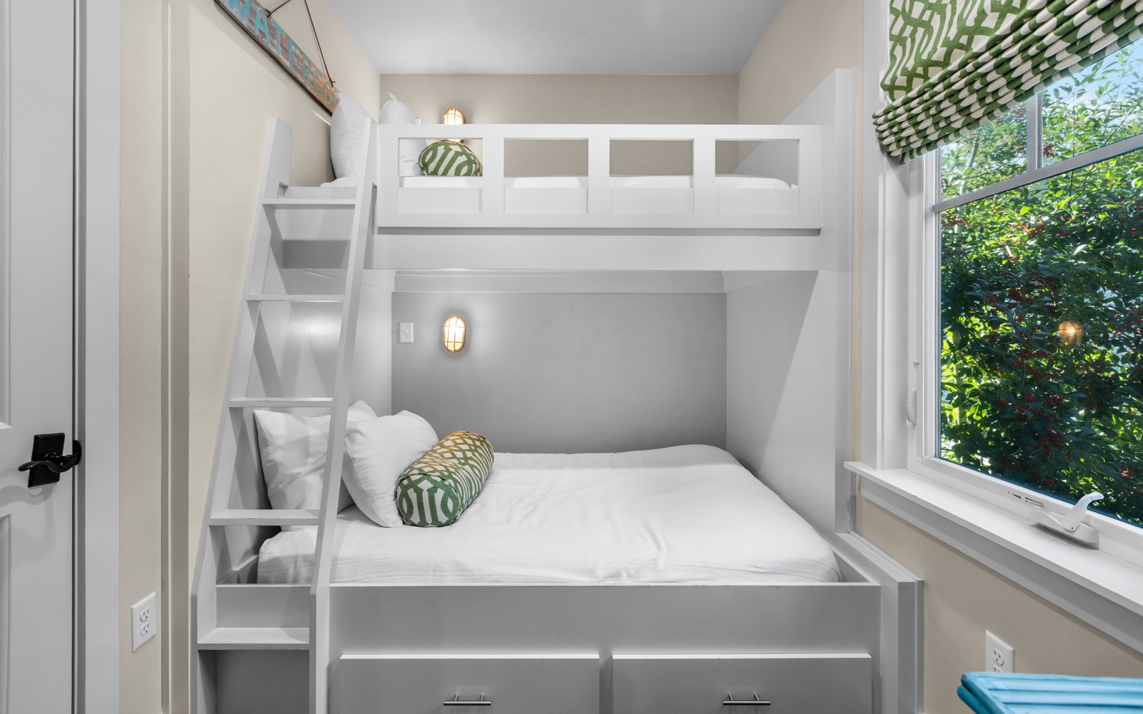 Head upstairs for four more bedrooms and a second living area perfect for movie nights, games, or that essential post-beach power-down. Sleeping options include a primary suite, king, a guest room, king, a guest room, queen, and a twin-over-full bunkroom.