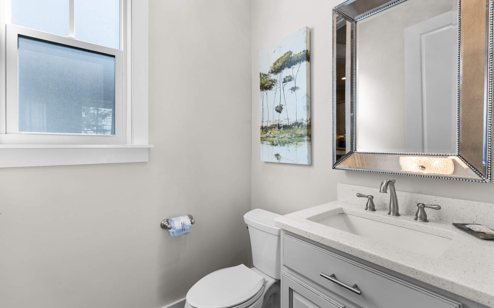 A serene primary suite, king, sits on this level with a spa-style bathroom and private balcony, along with a convenient powder room.